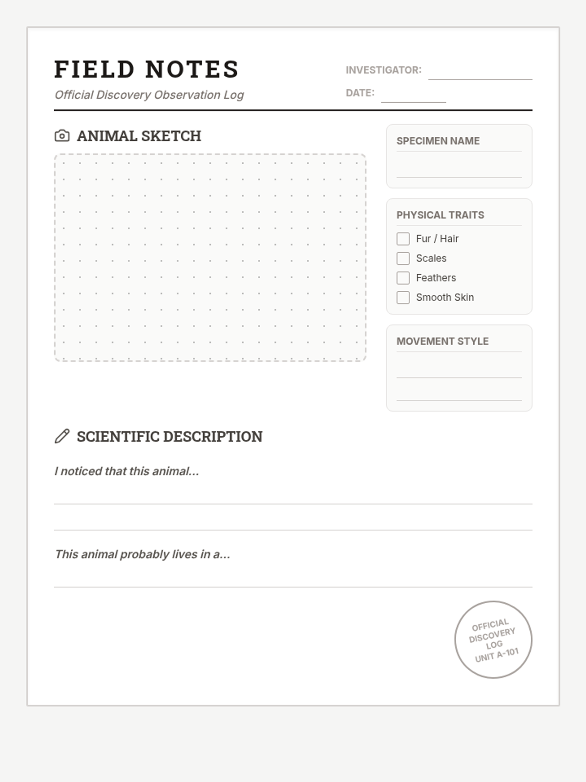 A field journal style worksheet for students to record their scientific observations, featuring a sketch area, trait checklist, and descriptive writing lines.