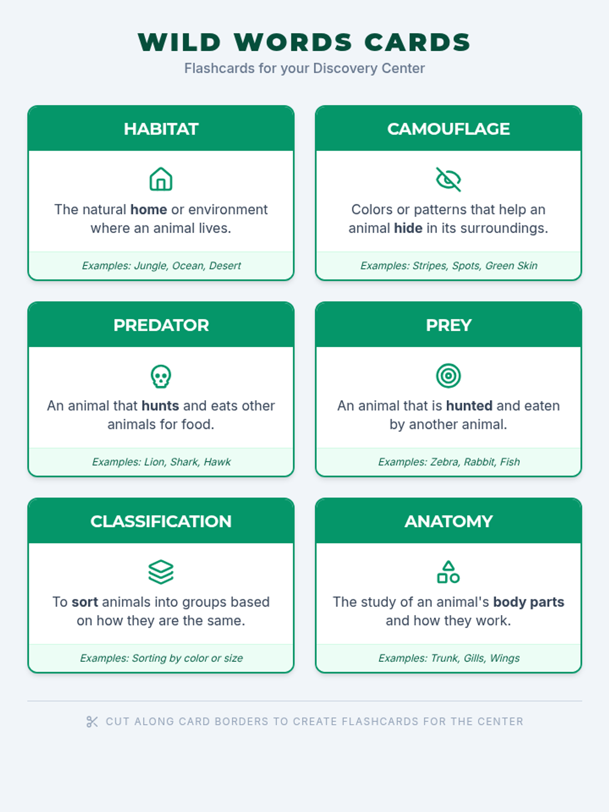 Visual vocabulary cards for the sensory center, providing simple definitions and examples for key science terms like habitat, camouflage, and classification.