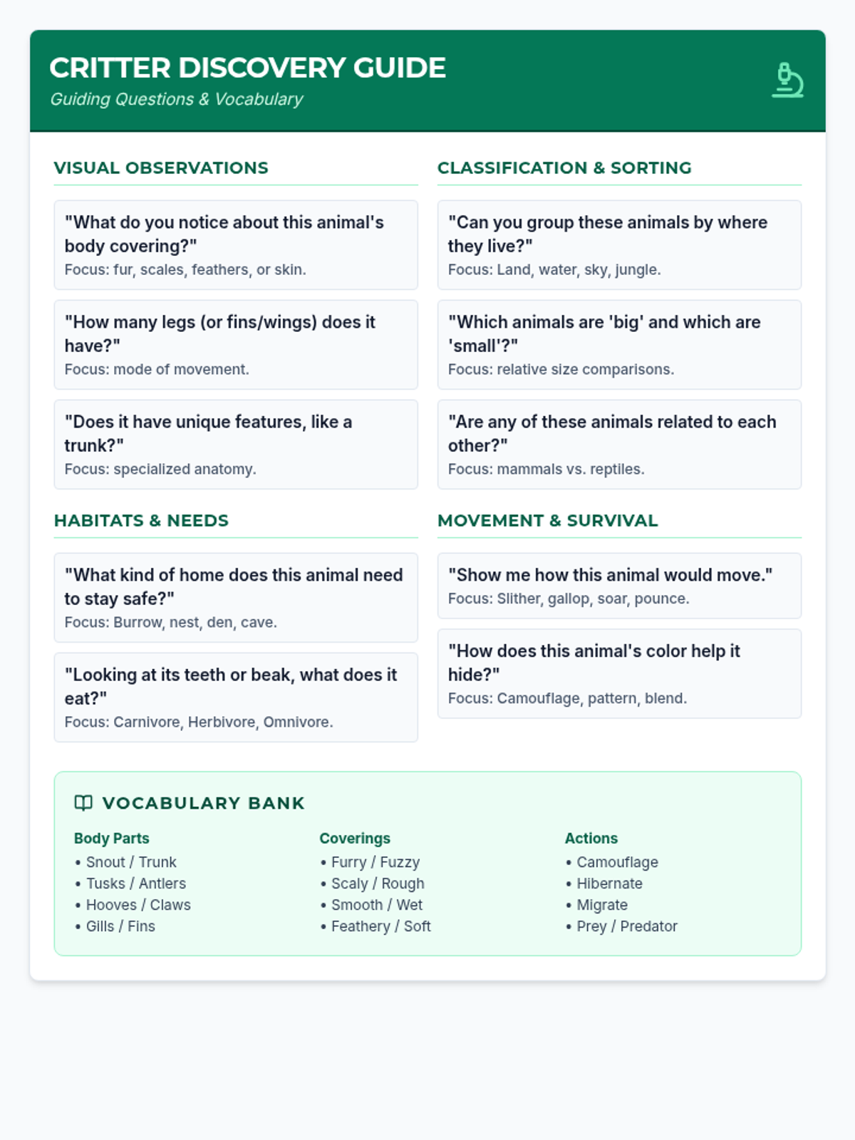 A teacher guide for the sensory center, featuring structured guiding questions and a vocabulary bank to facilitate science-based discussions.