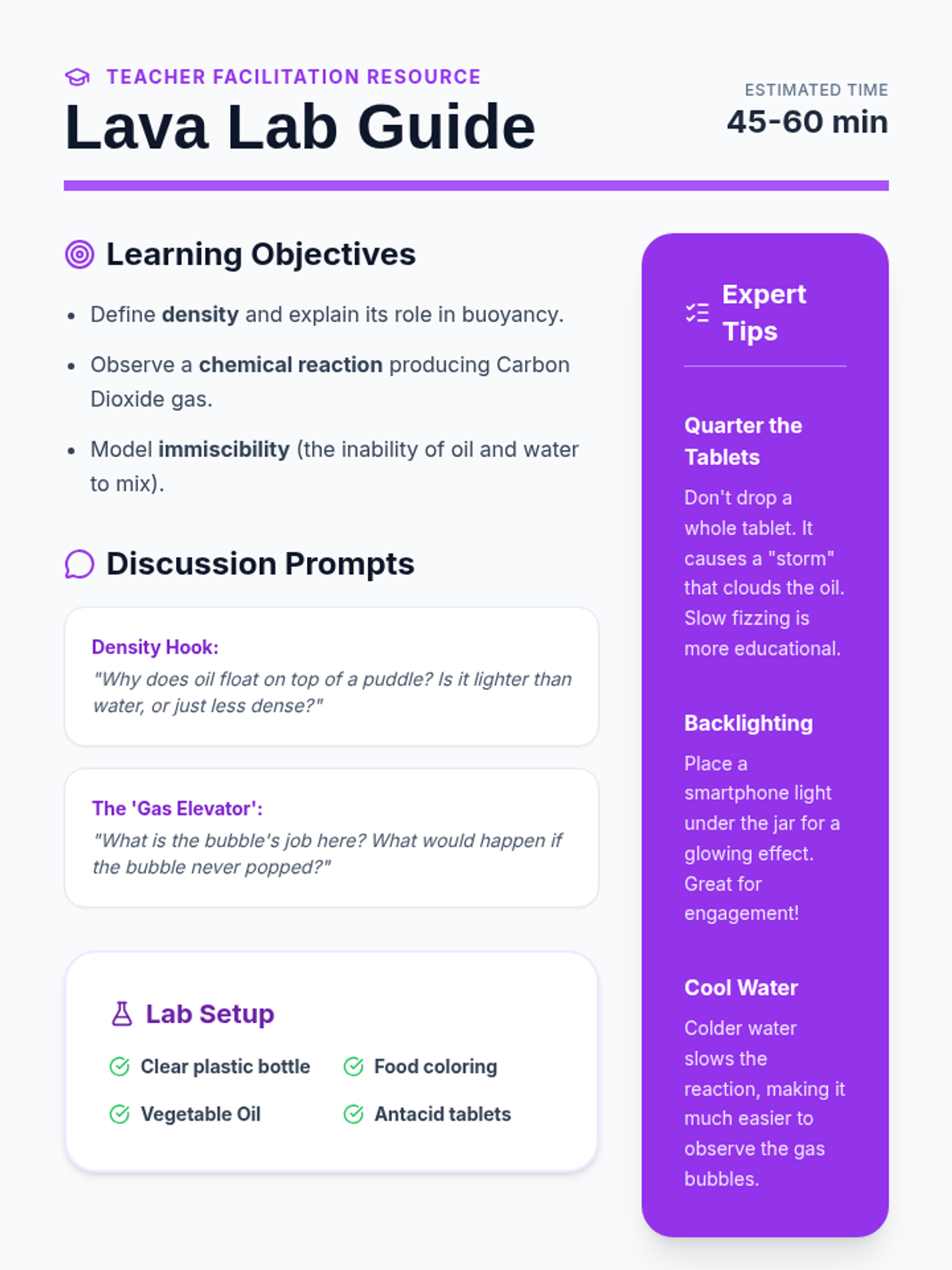 A comprehensive guide for teachers including learning objectives, discussion prompts, science troubleshooting tips, and pro-tips for facilitating the DIY lava lamp experiment.