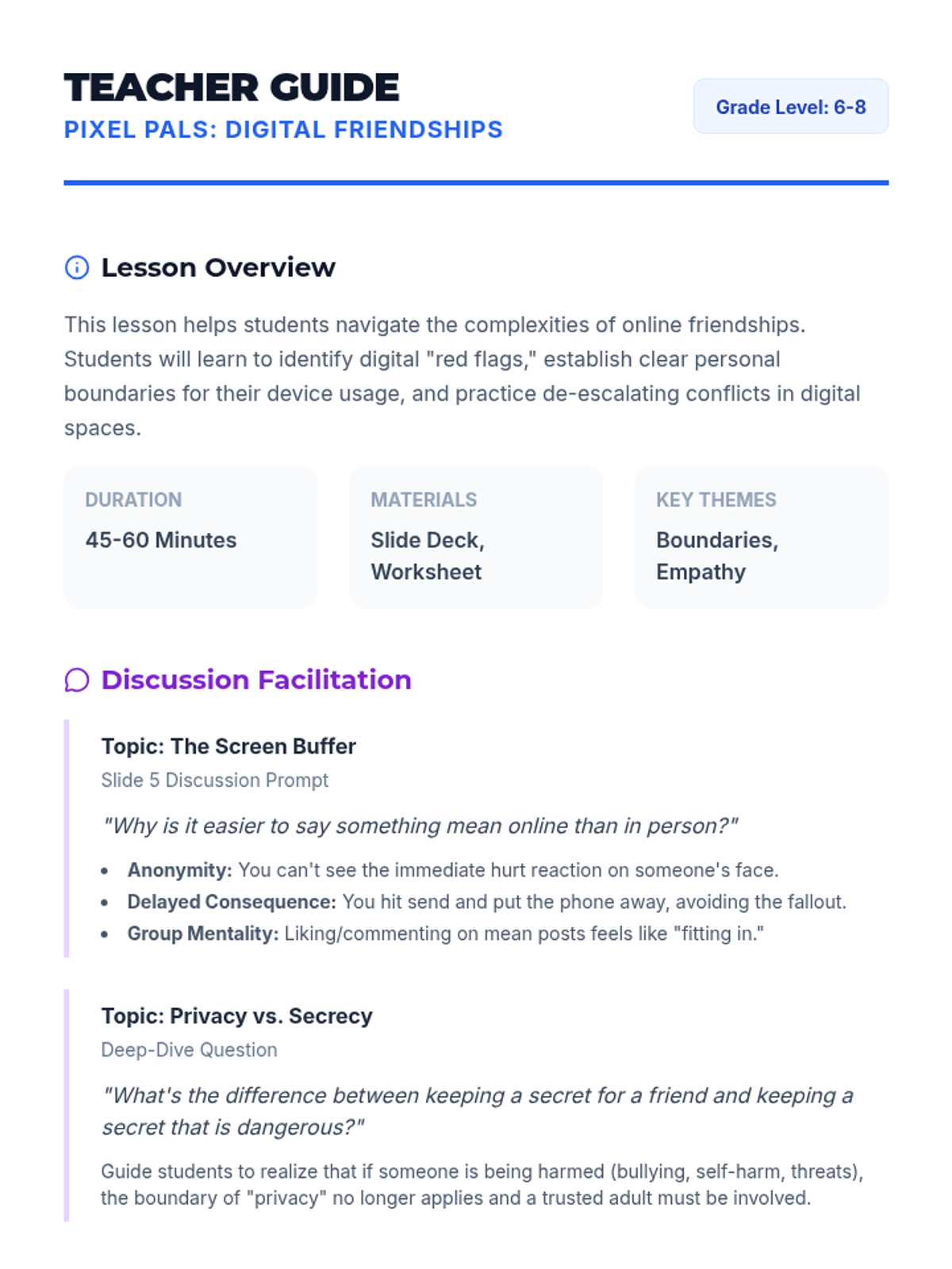 A visually engaging slide deck for teaching students about healthy online friendships, digital boundaries, and conflict resolution. Updated with improved font sizing and visual clarity.
