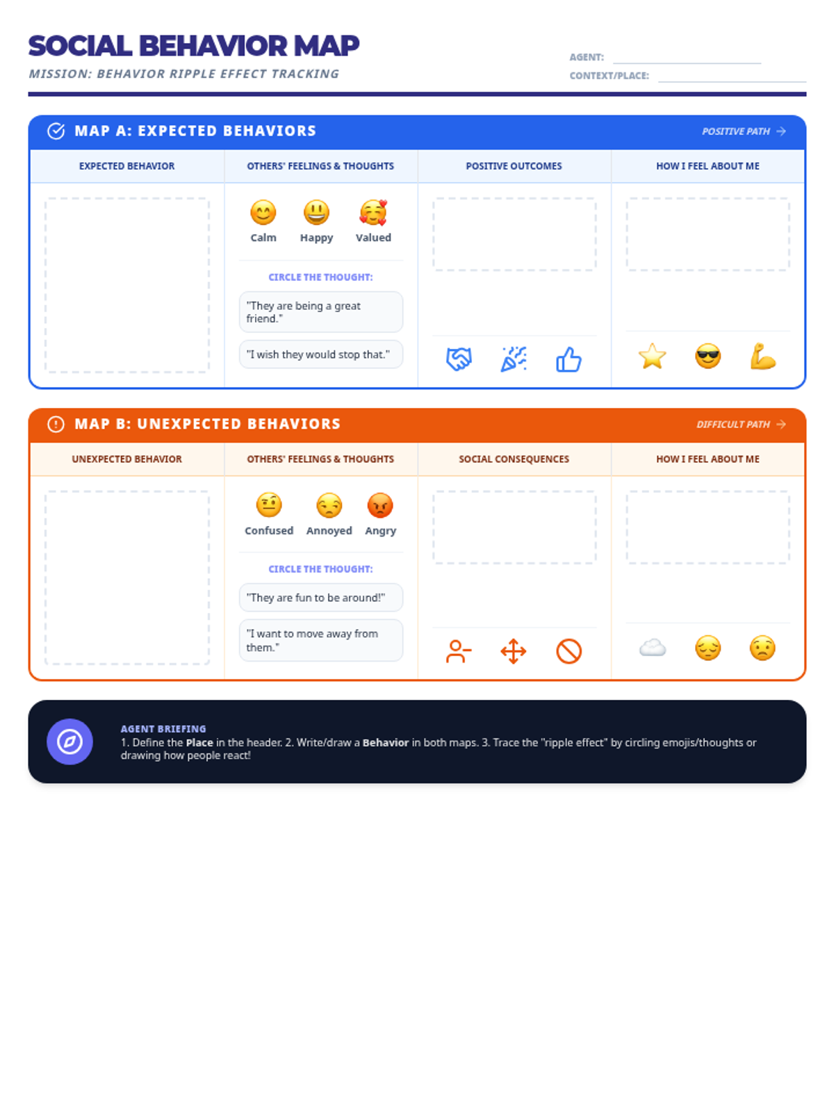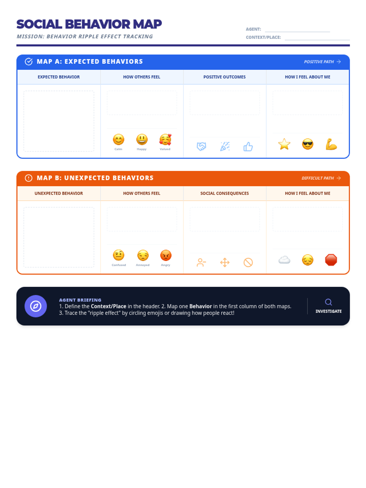A reformatted student activity handout that fits both the Expected and Unexpected Social Behavior Maps onto a single page for easier printing and consolidated mapping, now featuring emoji choices for feelings and self-esteem.