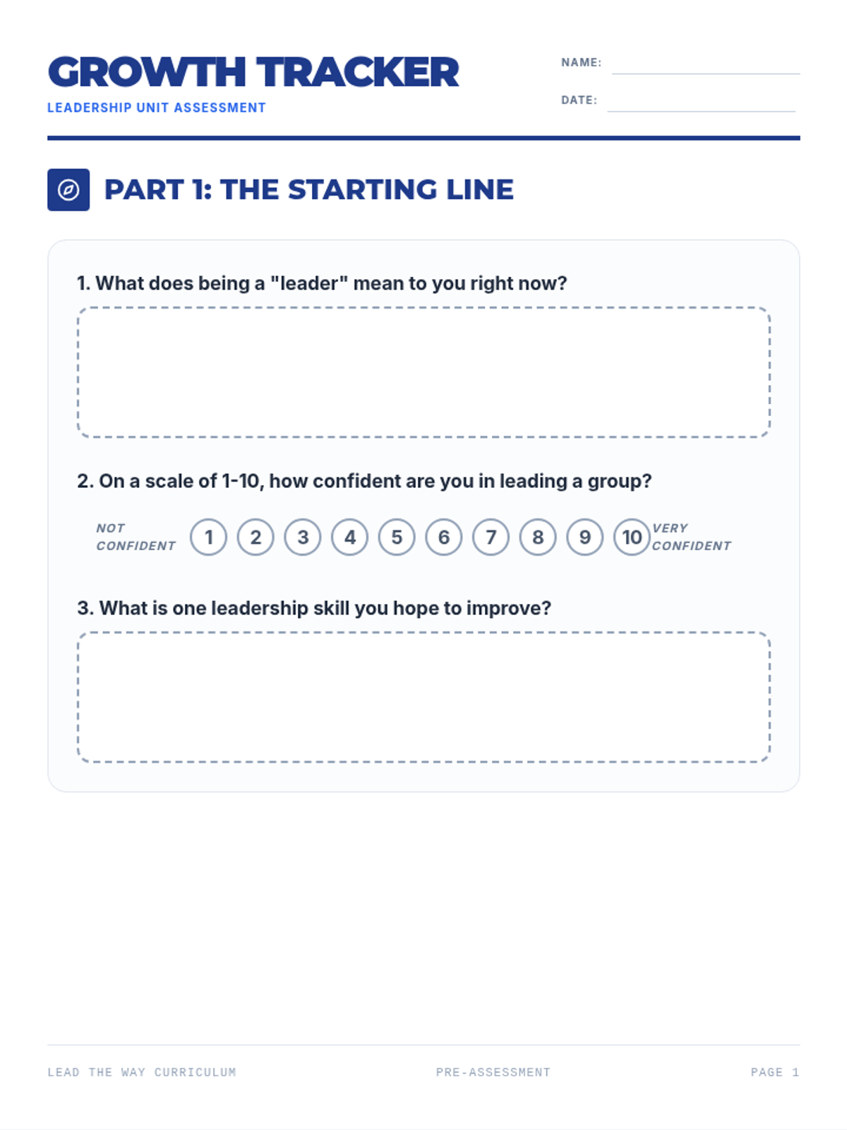 A pre and post assessment worksheet for the Lead the Way curriculum, allowing students to track their growth in leadership definition, confidence, and skill development. Now split into clear Pre and Post pages.
