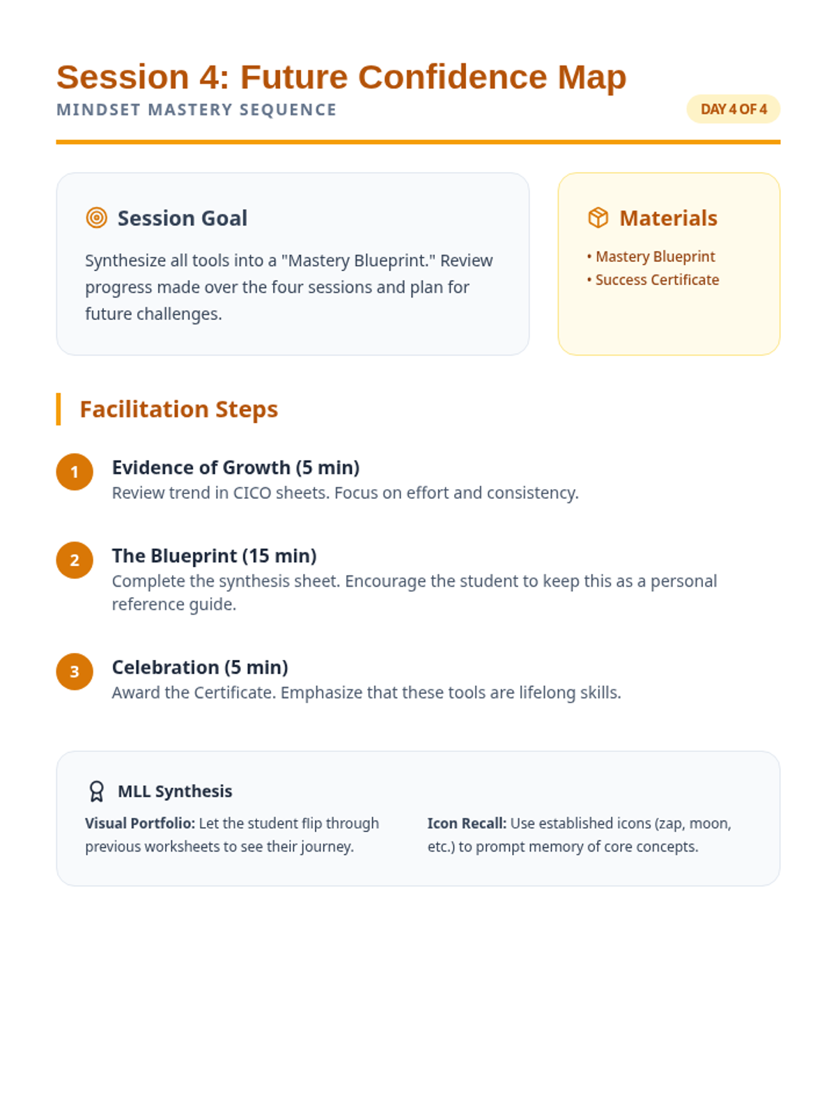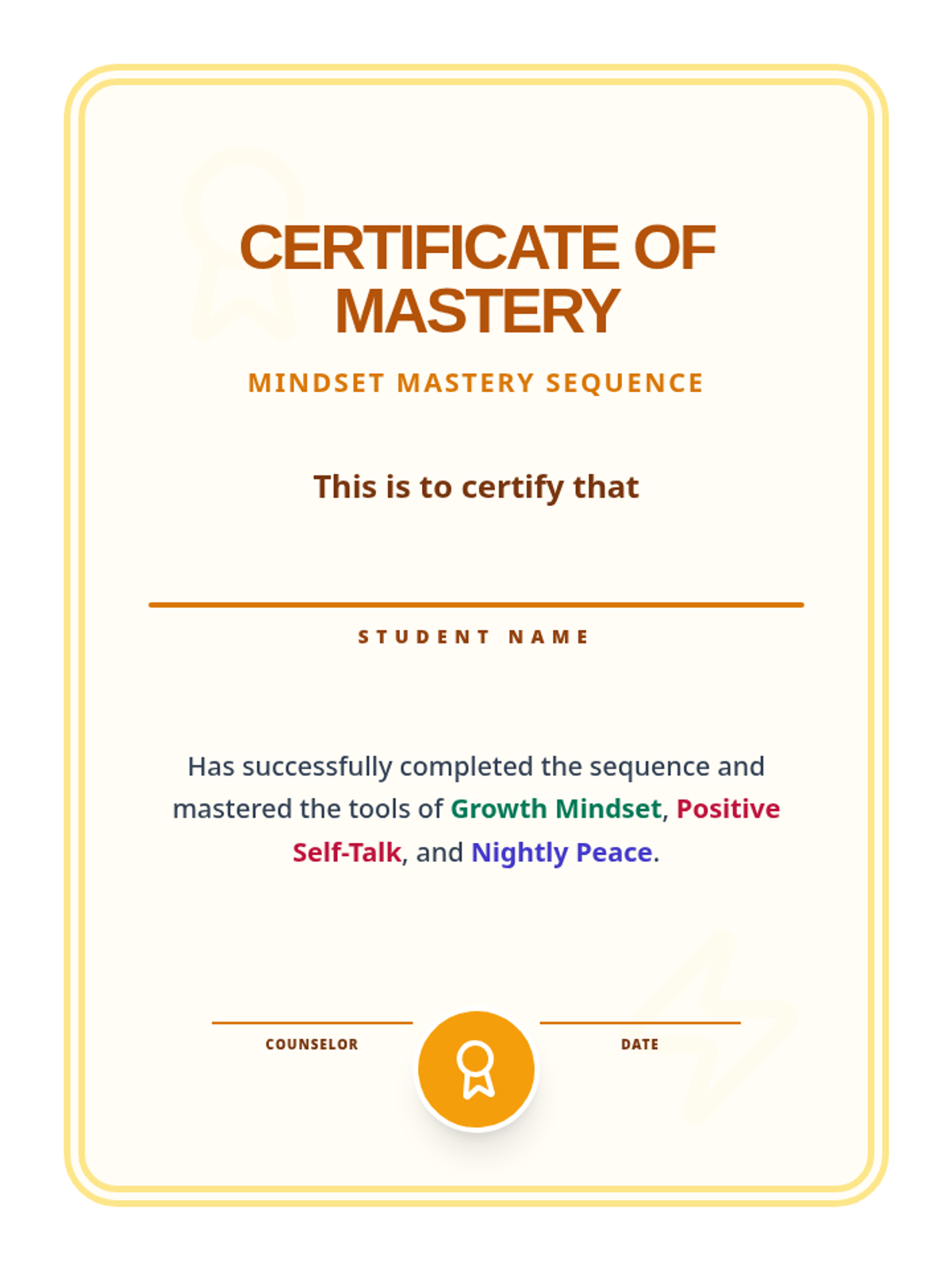 A celebration certificate for students who complete the Mindset Mastery Sequence, reinforcing their achievement and confidence. Improved layout and overlap fixes. Darker signature lines. Moved seal to avoid signature overlap. Larger name area and text. Forced to fit single page. Improved contrast.