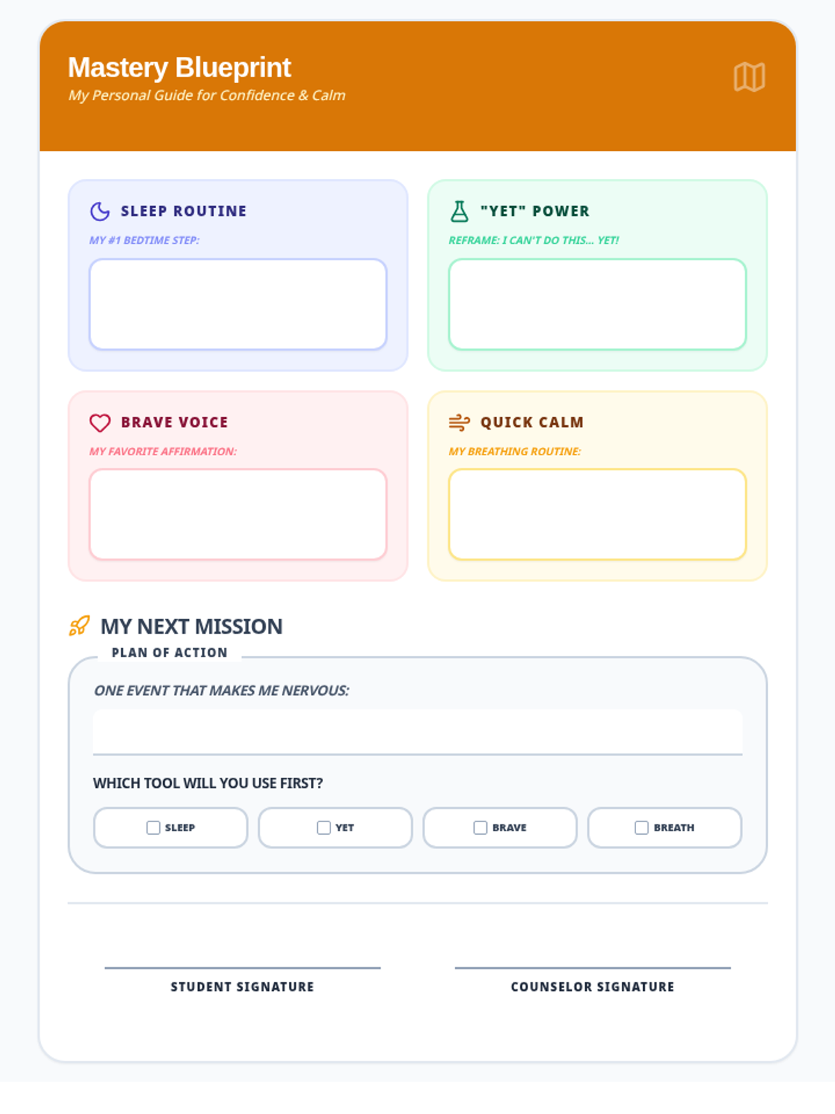 Student synthesis document for Session 4, acting as a personal 'survival guide' or blueprint for future anxiety management. Improved writing spaces, larger labels, and tool selection checkboxes. Larger toolbox boxes. Fixed page layout.