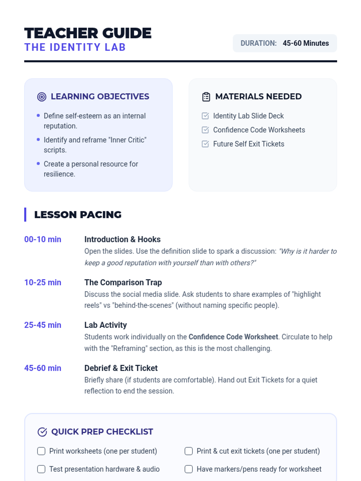A comprehensive guide for teachers to lead 'The Identity Lab' lesson, including pacing, discussion prompts, and sensitive topic handling.