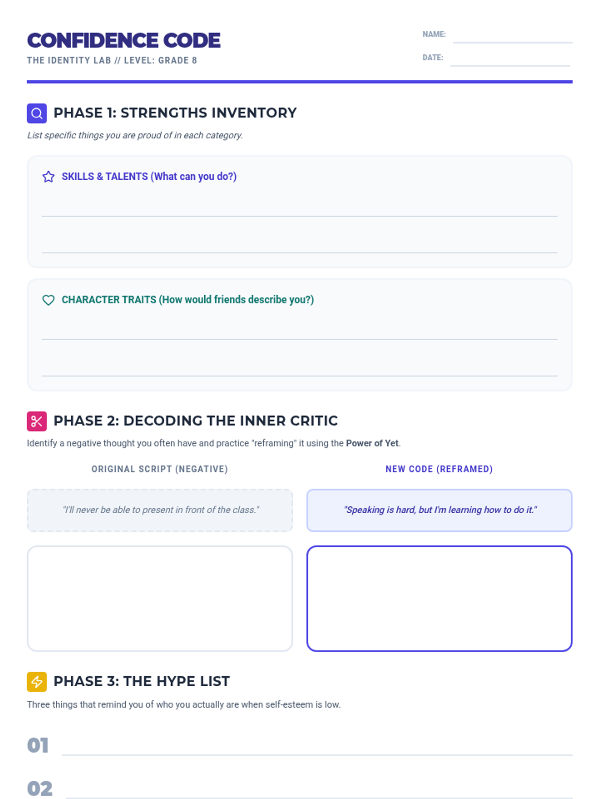 A structured worksheet for students to inventory their strengths, practice reframing negative self-talk, and create a personal 'Hype List' for difficult days.