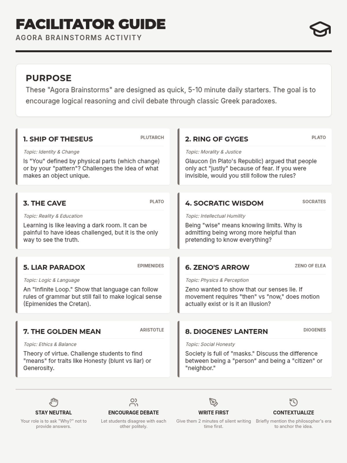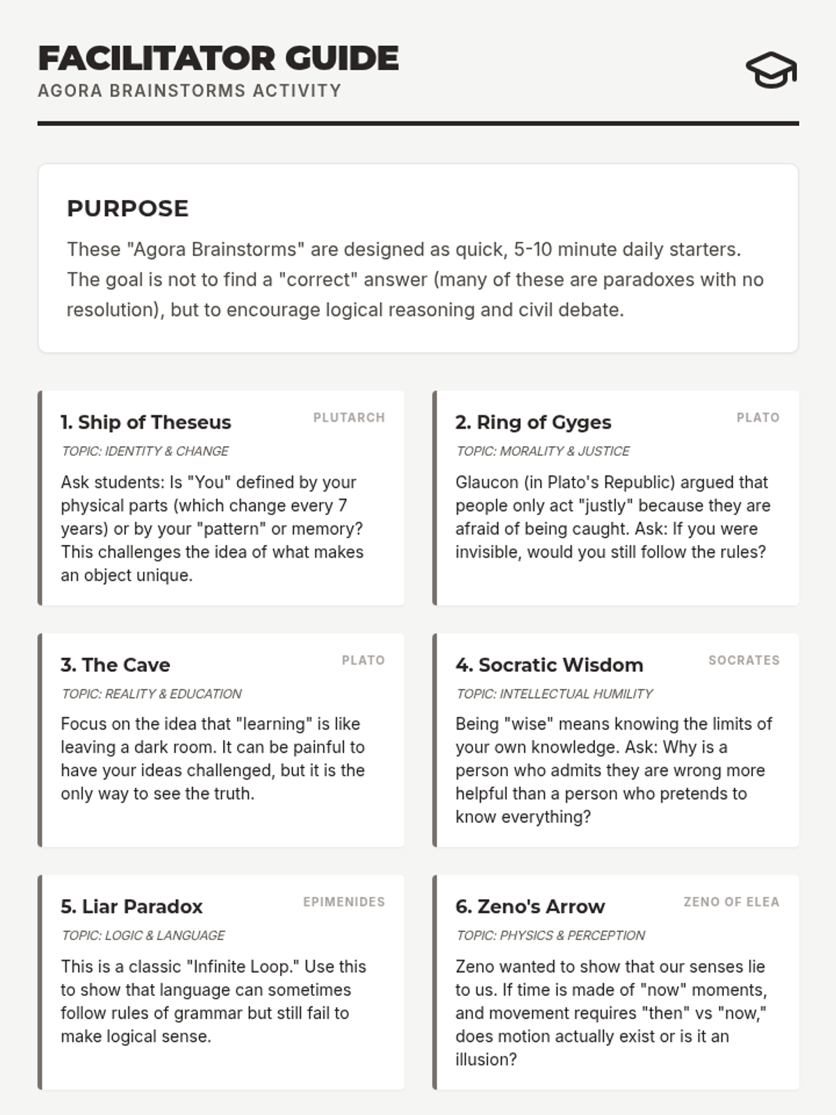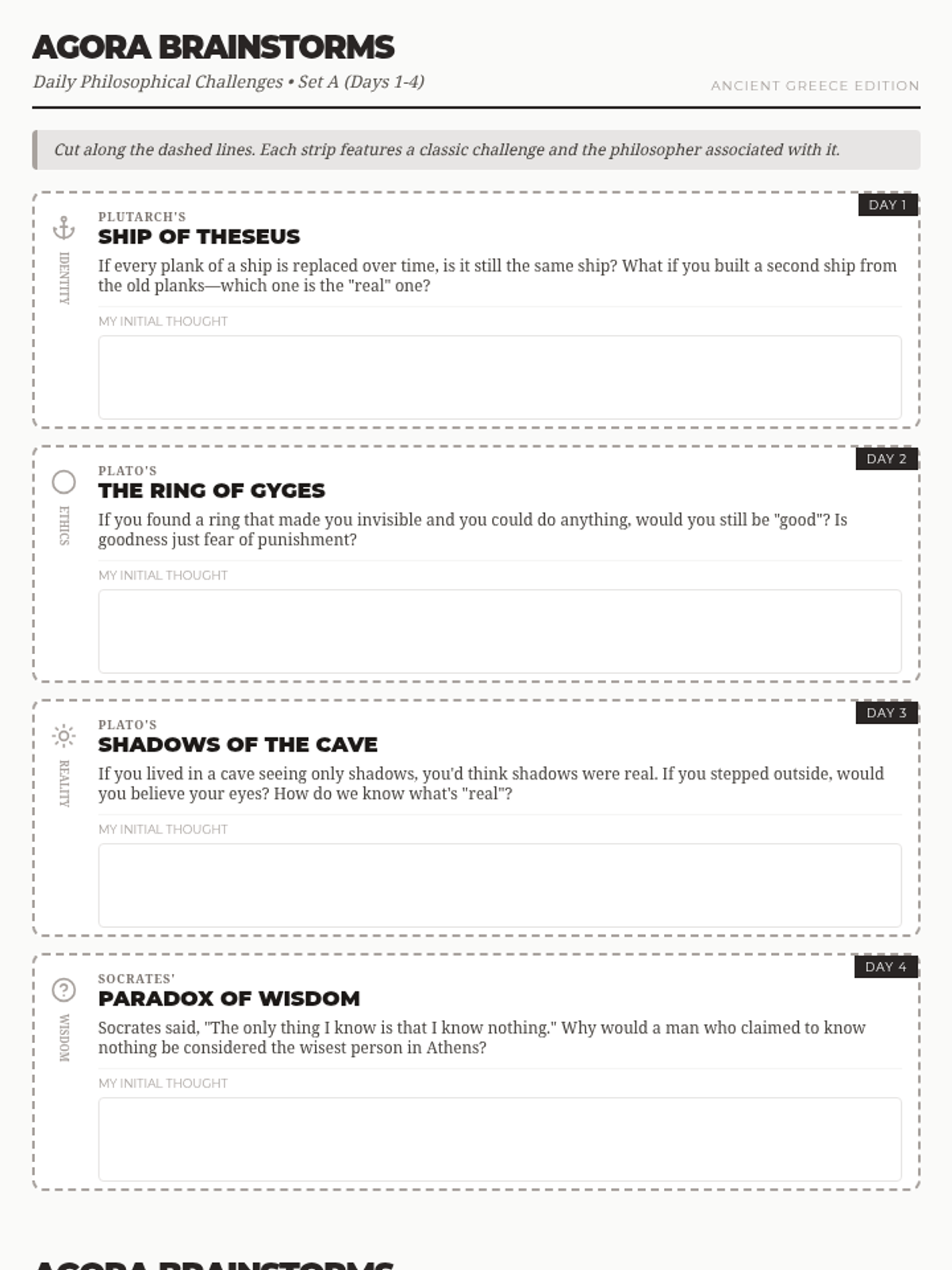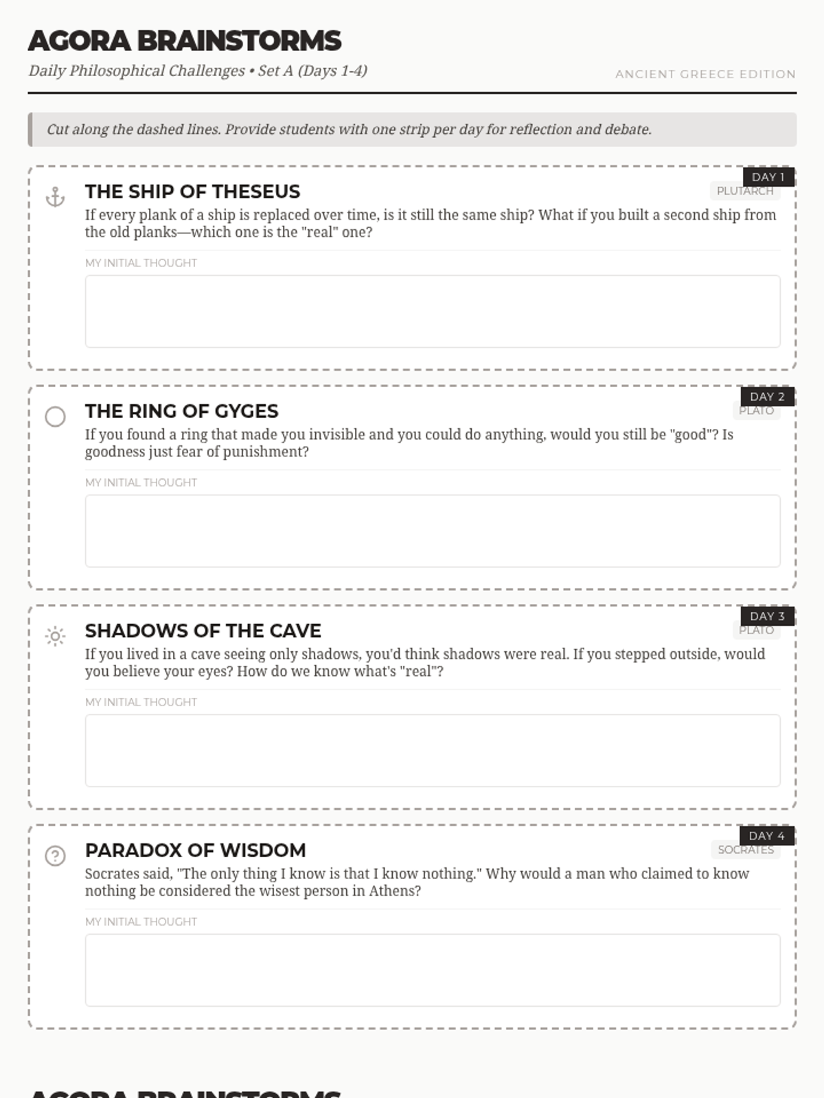 Printable strips for students featuring classic Greek philosophical paradoxes, now updated to include the specific philosopher attributed to each thought experiment.