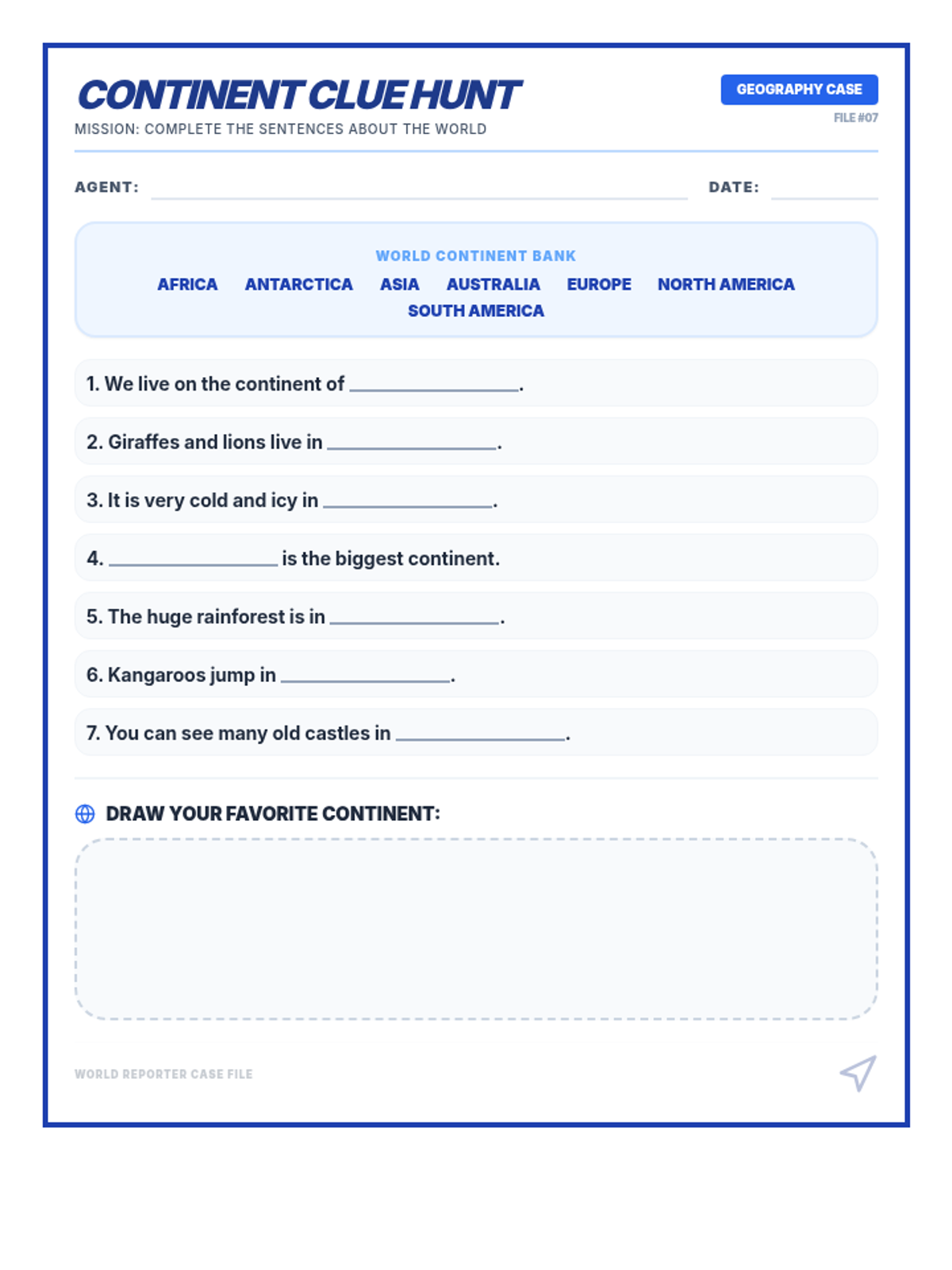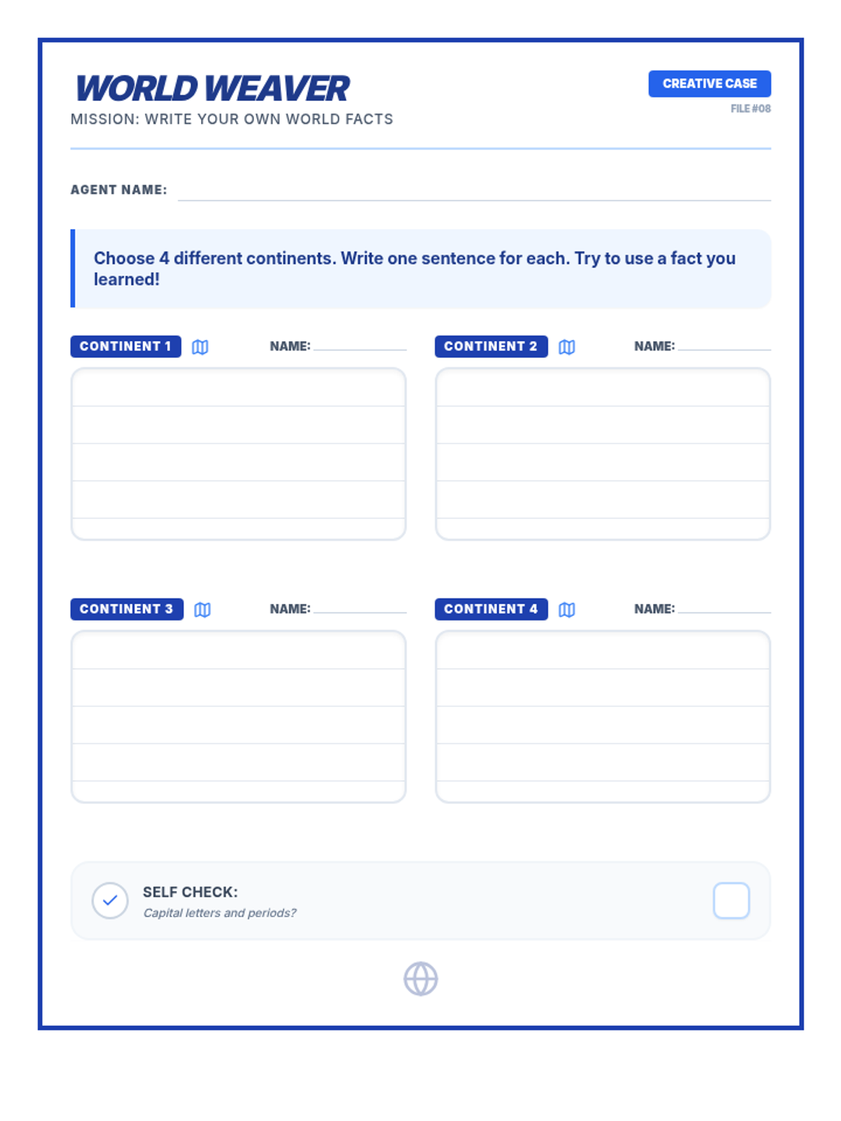 A sentence construction activity where students choose continents and write their own sentences using learned facts. Includes guided lines and checkboxes for self-review. Revised for improved placeholder sizing and comprehensive review check.