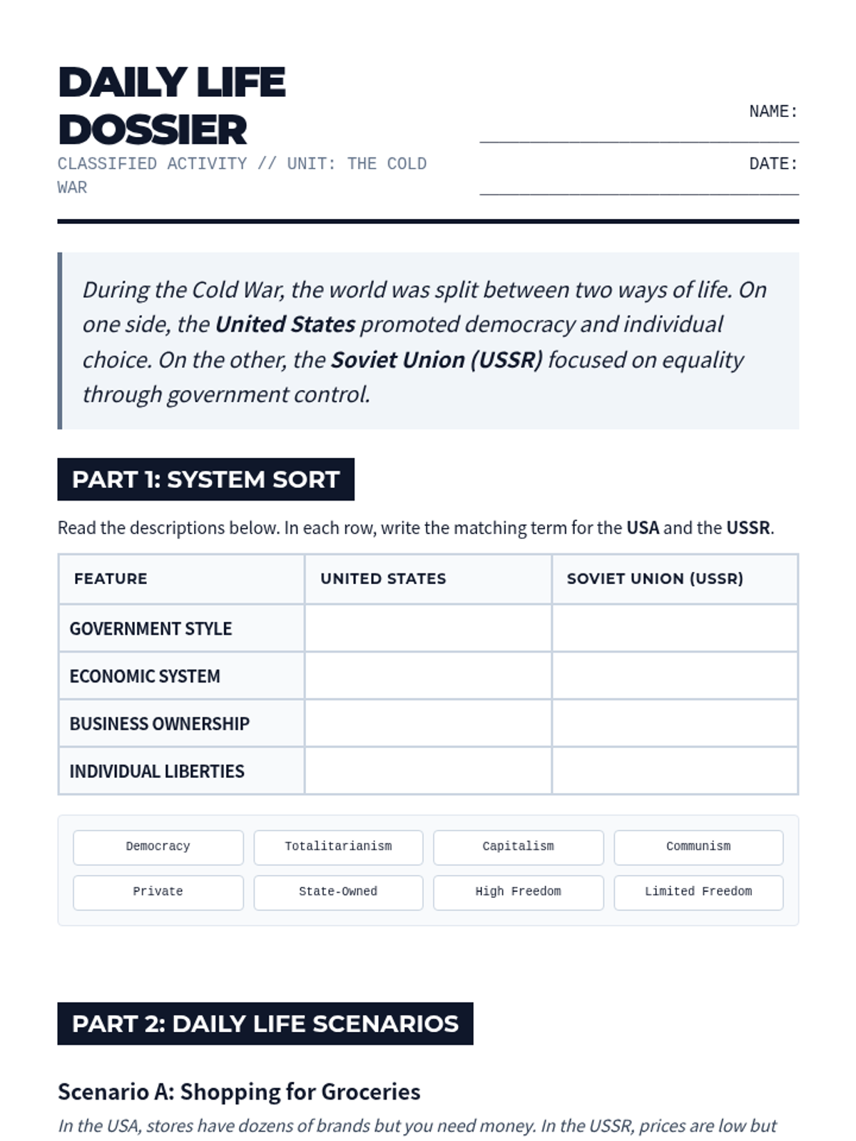 Student worksheet containing an expanded comparison chart and 6 scenario-based reflection questions regarding life in the USA and USSR during the Cold War. Features scaffolded writing prompts and a system sorting activity.