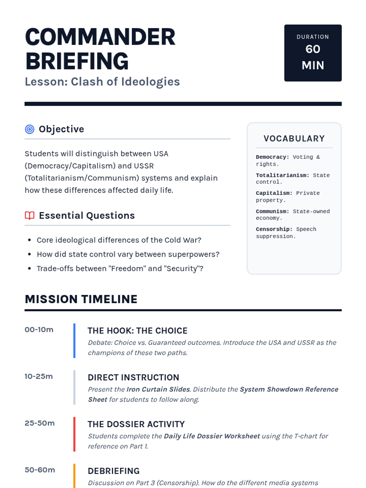 Teacher guide for the "Clash of Ideologies" lesson. Includes instructional objectives, essential questions, a detailed lesson timeline, key vocabulary, and an answer key for the student worksheet.