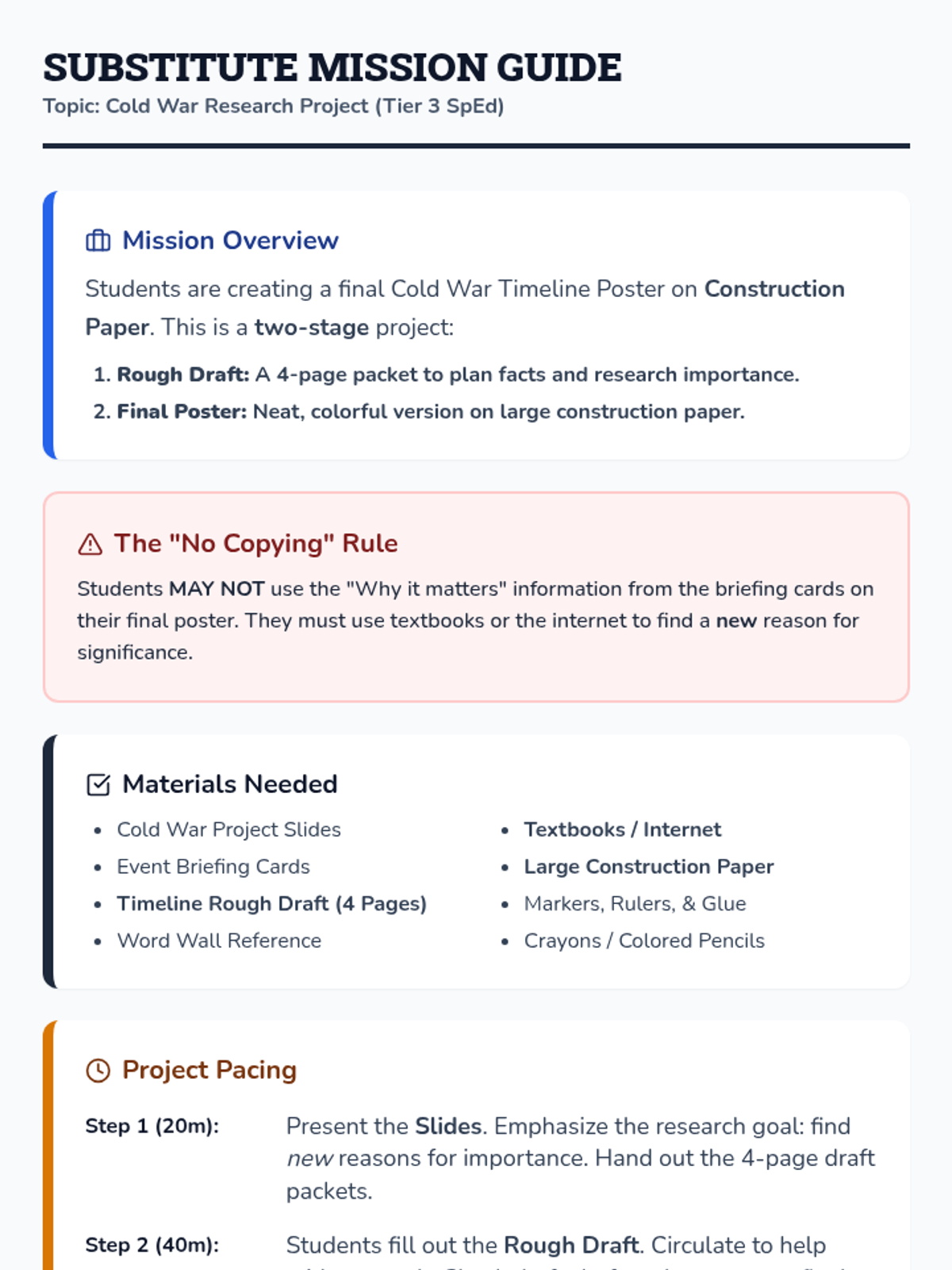 A detailed facilitation guide for substitute teachers, providing a lesson summary, research focus, pacing guide, and specific SpEd-focused teaching tips for the two-stage Cold War timeline project. Revised to include the rough-draft-to-final-poster workflow.
