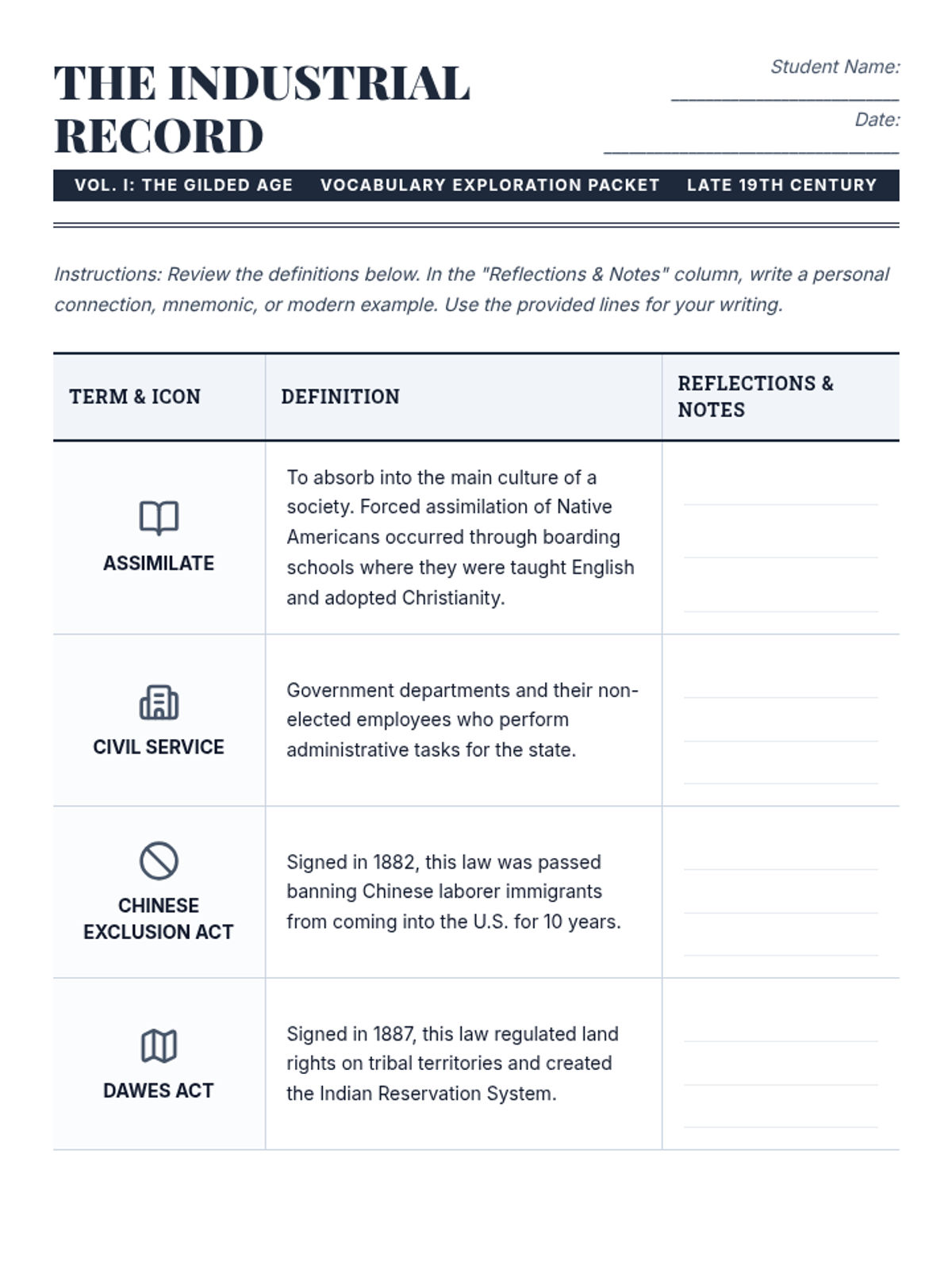 A comprehensive vocabulary packet for students covering the Gilded Age and Progressive Era. It features key terms, definitions, thematic icons, and a dedicated space for student notes and reflections.