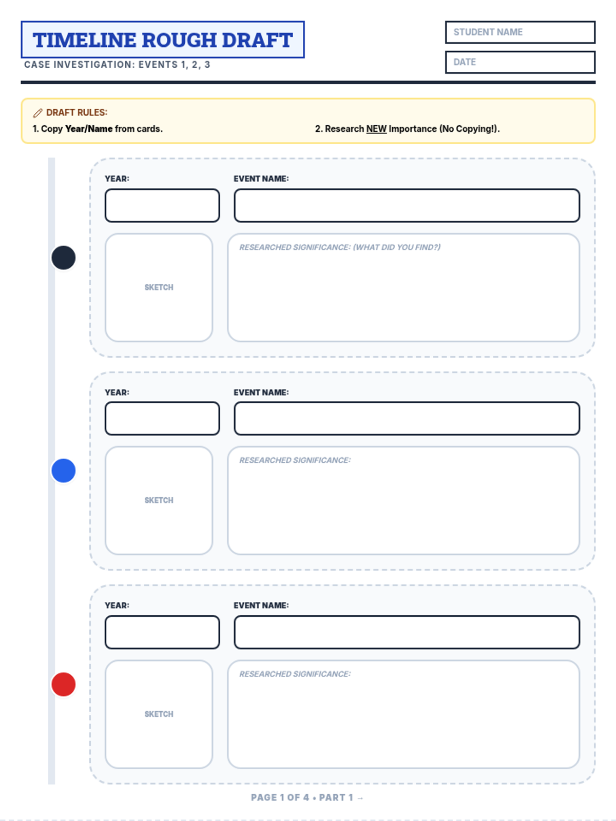 A 4-page rough draft template for the Cold War timeline project. Provides significantly larger work areas for sketching and researched significance for each of the 10 events. Tailored for Tier 3 SpEd students with expanded writing space and defined input boxes.
