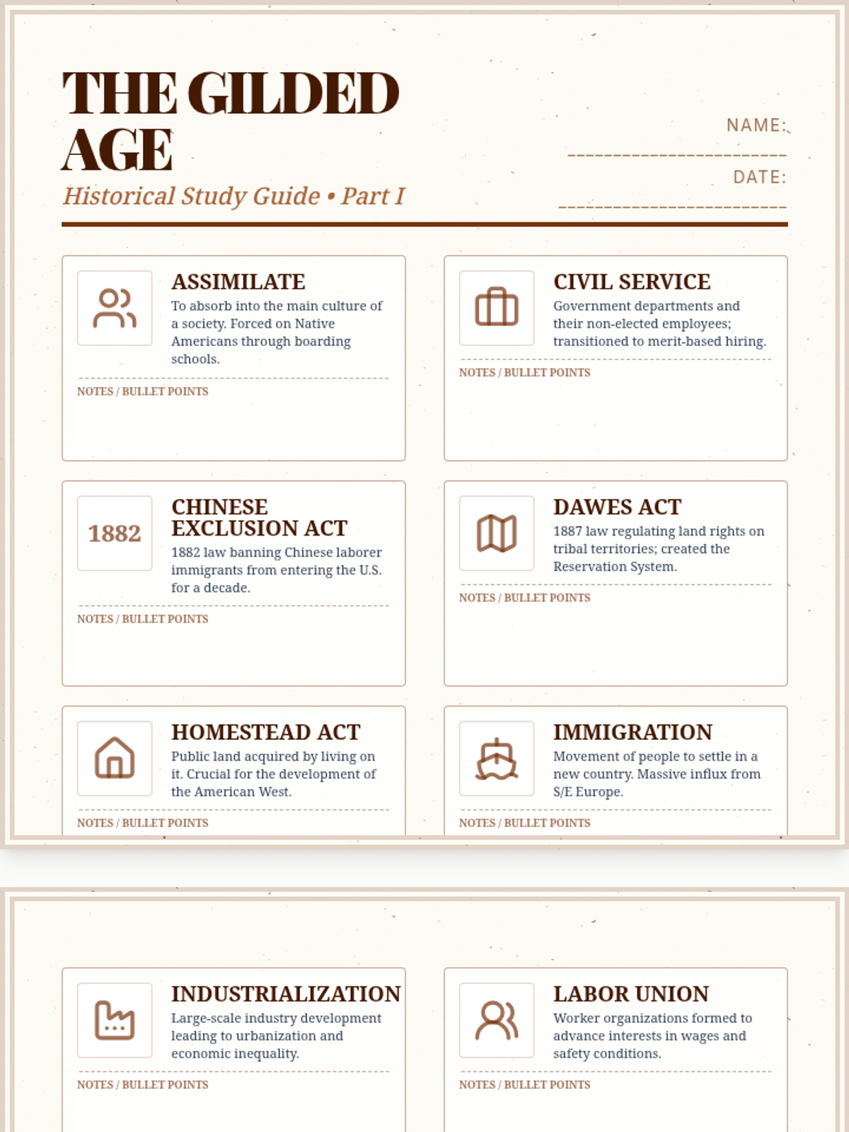 A landscape-format study guide covering key terms from the Gilded Age and Progressive Era. Each term includes a definition, a representative icon, and a dedicated space for student notes. Optimized for printing with 6 terms per page. Final version with improved contrast and consistent labeling.