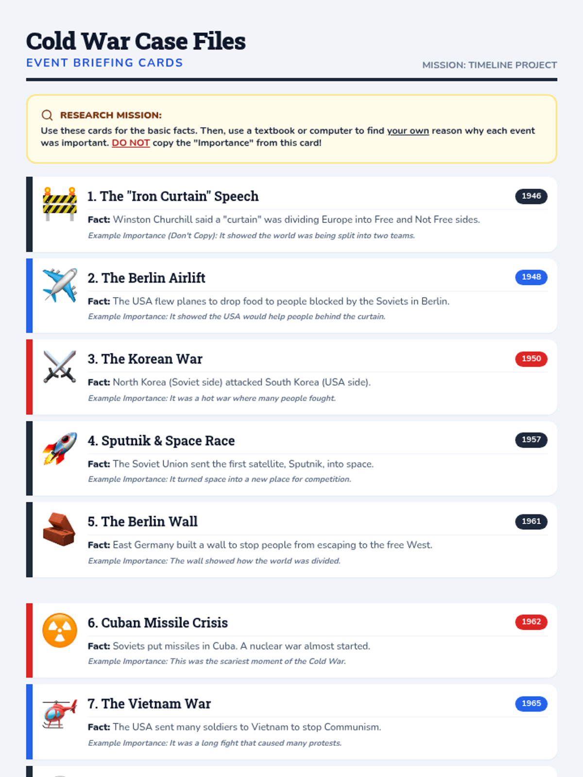 An instructional slide deck designed for a substitute teacher to present a Cold War timeline project. Updated to include a two-stage mission: using briefing cards for a rough draft and research (books/internet) for a final construction paper poster. Includes "Research Challenge" prompts for each of the 10 events.