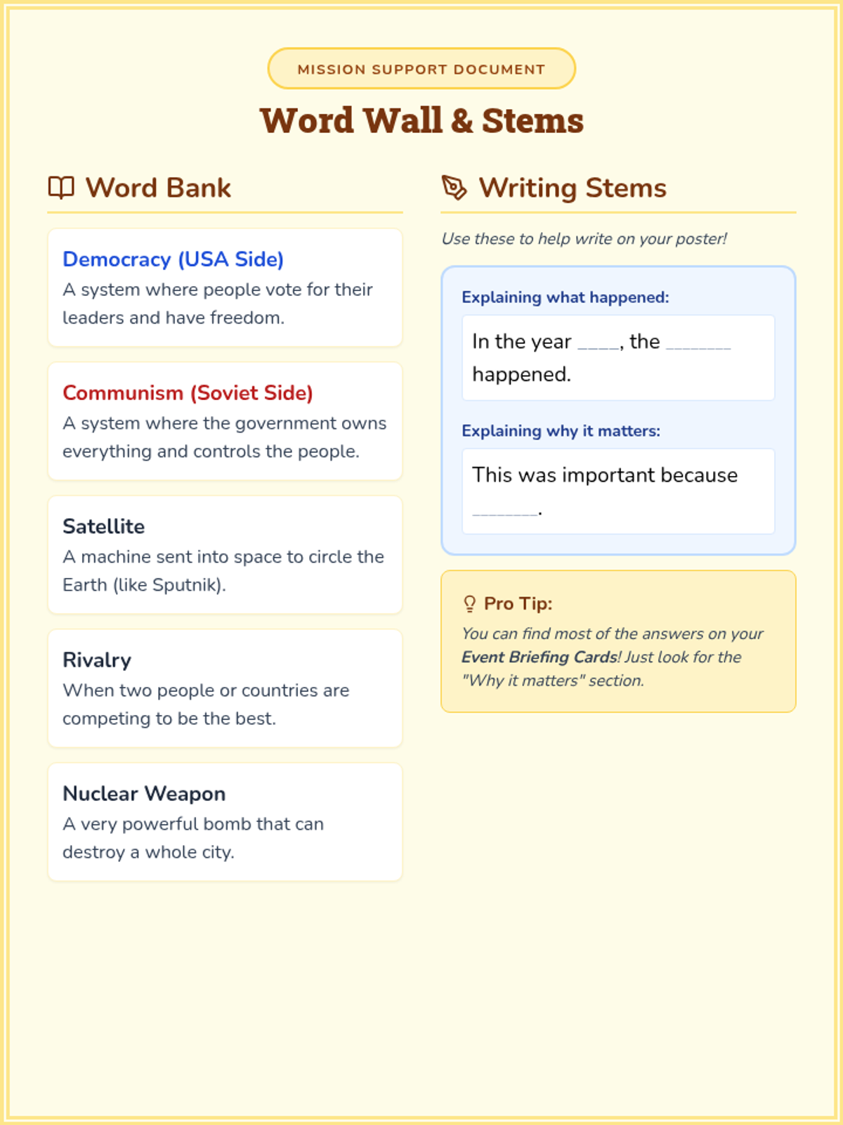 A reference sheet for Tier 3 SpEd students containing simplified Cold War vocabulary definitions and sentence stems to assist with timeline writing tasks. Revised for better page fitting.