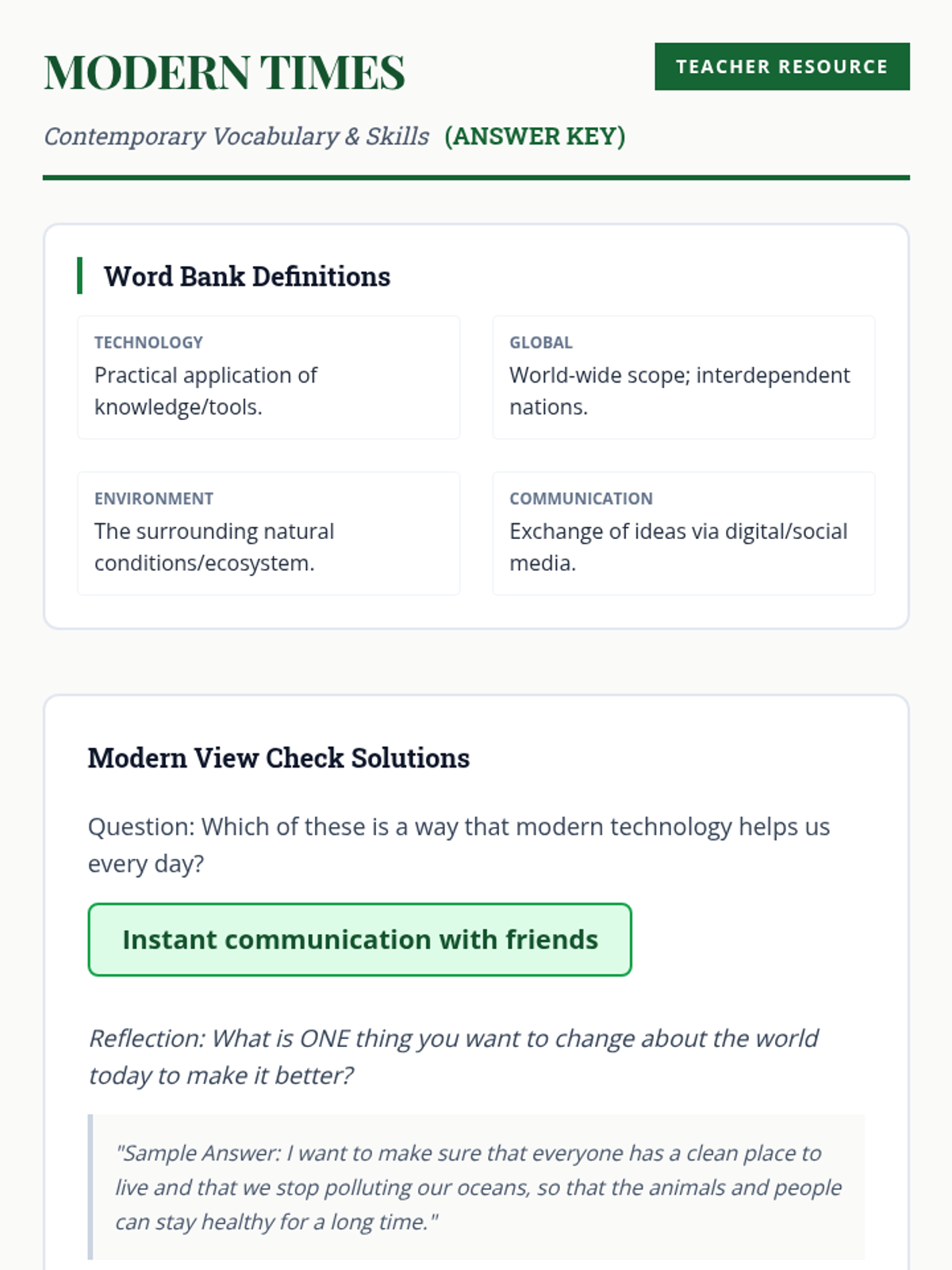 Teacher-facing answer key for the Modern Times Vocabulary Guide, providing historical context and instructional tips for contemporary American society.