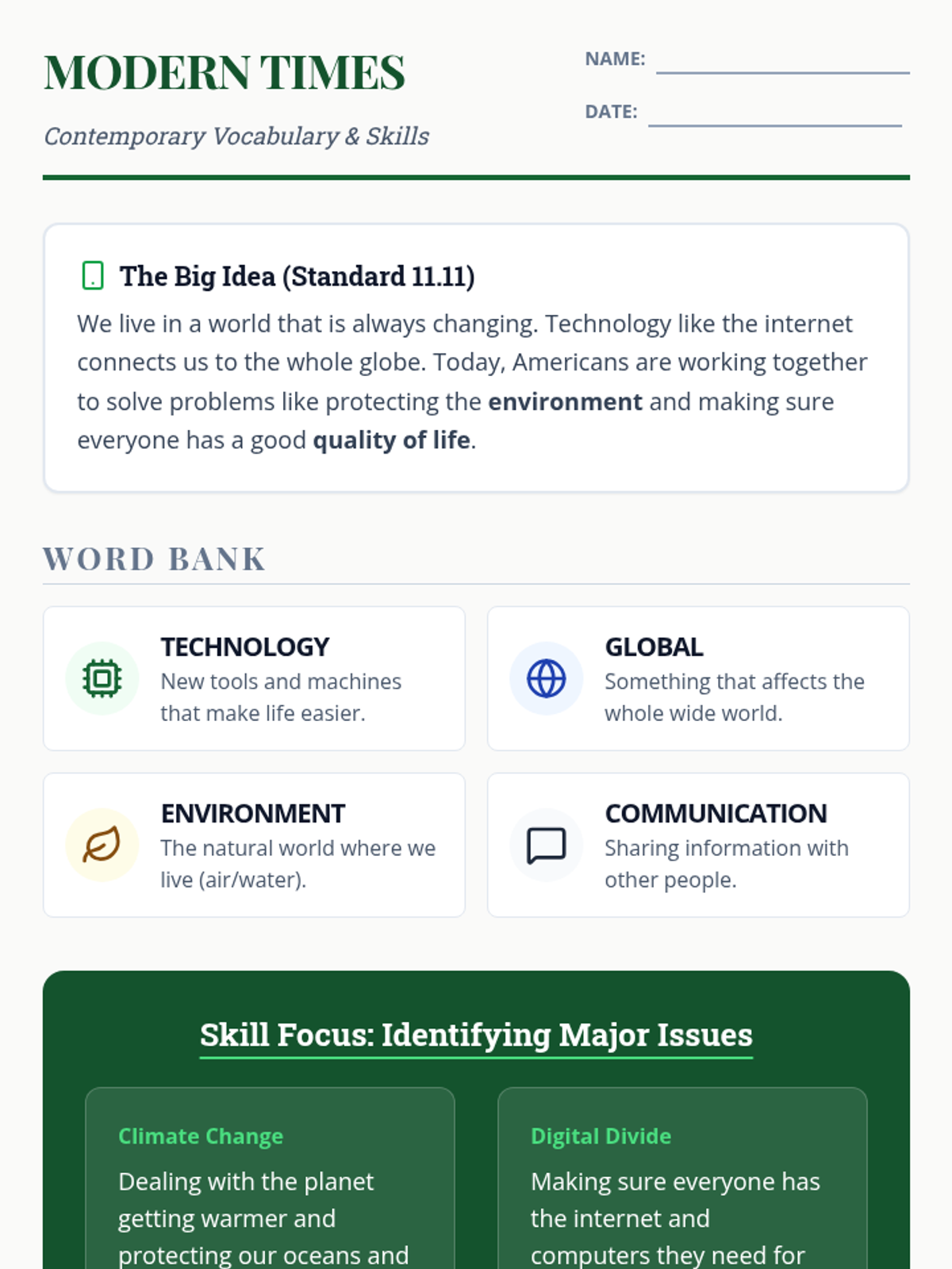 A student-facing vocabulary and skills guide for contemporary American issues, featuring simplified definitions and a focus on technology and the environment for Tier 2 and 3 support.