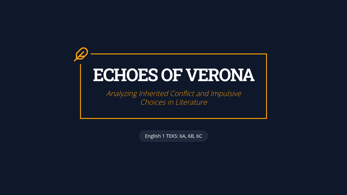 An instructional slide deck covering TEKS 6A, 6B, and 6C. It connects the themes of Romeo and Juliet to the provided short story, analyzes character motivation and figurative language, and sets up the partner discussion activity.