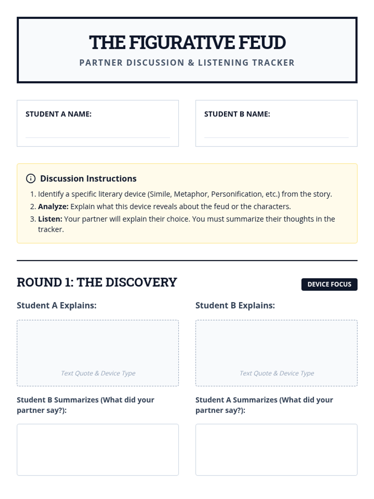 A partner discussion guide and listening tracker designed to facilitate peer analysis of figurative language and character motivation. Students record their own findings and summarize their partner's insights, meeting the listening and speaking requirements.