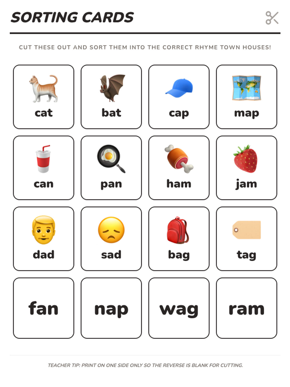 Rhyming/blending cards with words and icons for sorting. Labels removed from primary cards to challenge students to blend and identify the family independently.