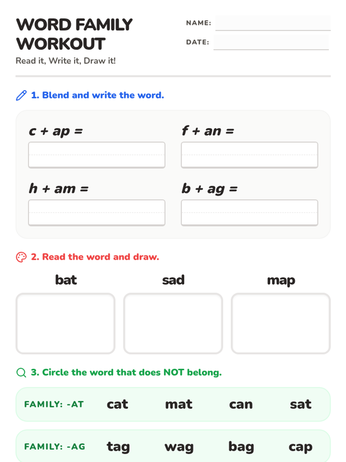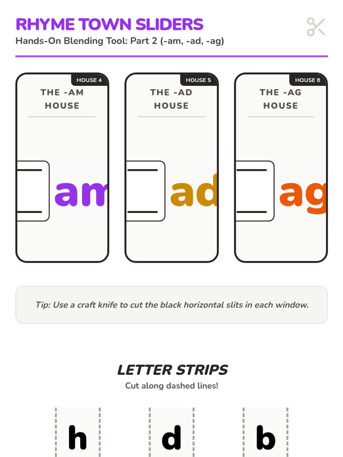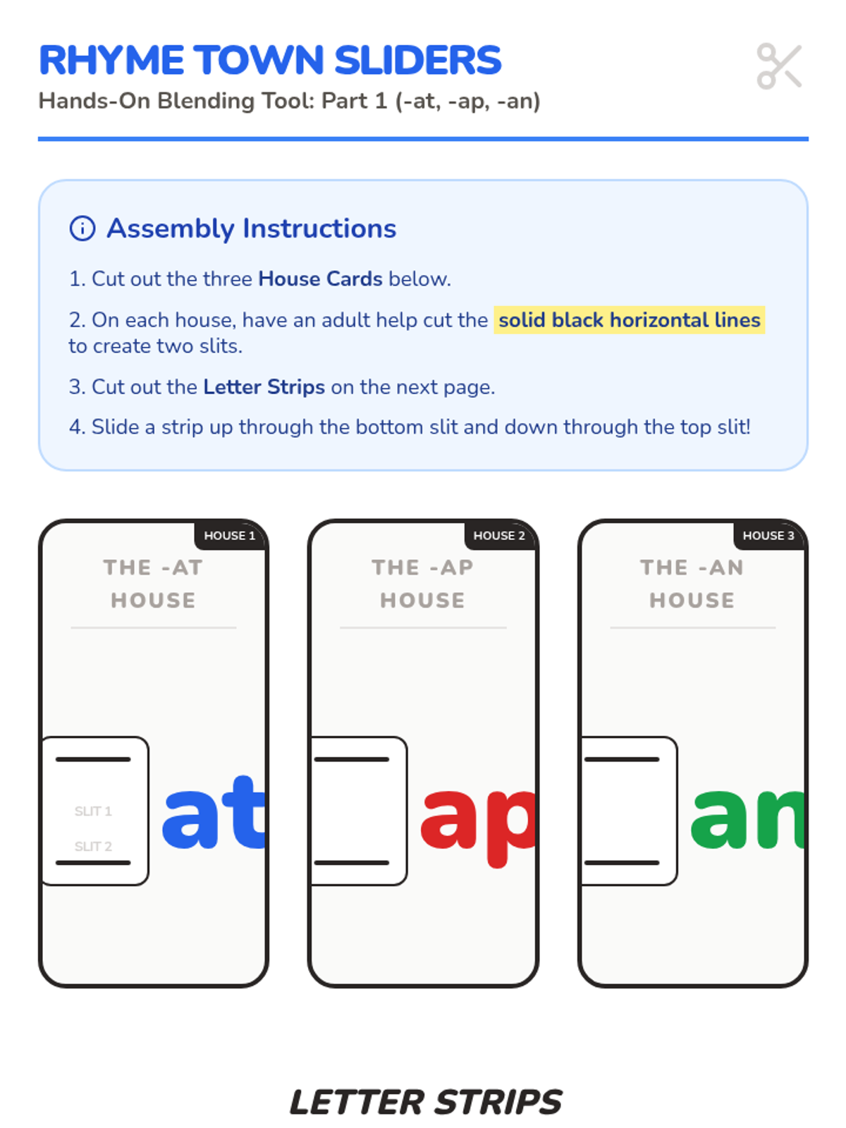 A printable DIY blending tool where students slide letter strips through "word houses" to create and read different words in a family. Includes at, ap, and an families.