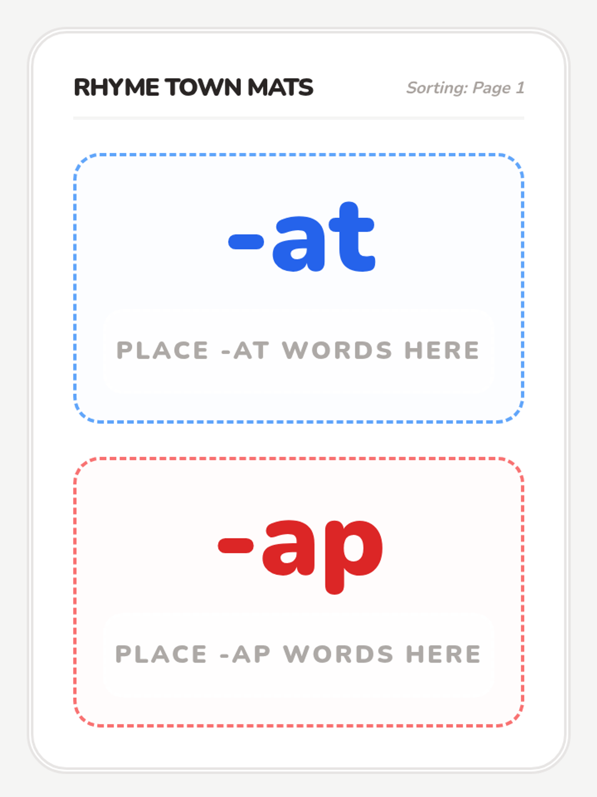 Large, color-coded sorting mats for word family centers. Two mats per page to ensure enough space for sorting cards.