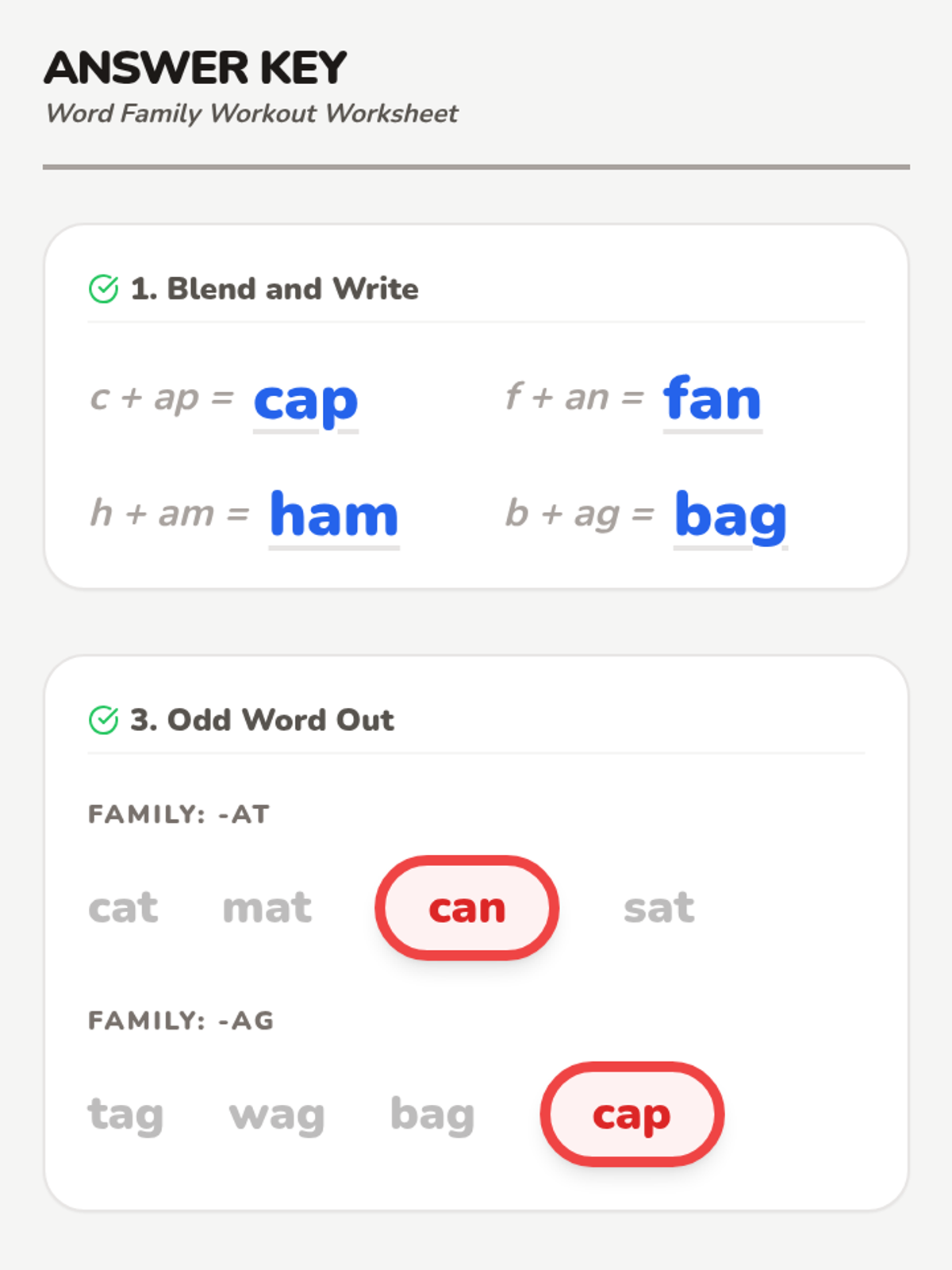 Answer key for the Word Family Workout worksheet with corrected page flow and higher contrast.