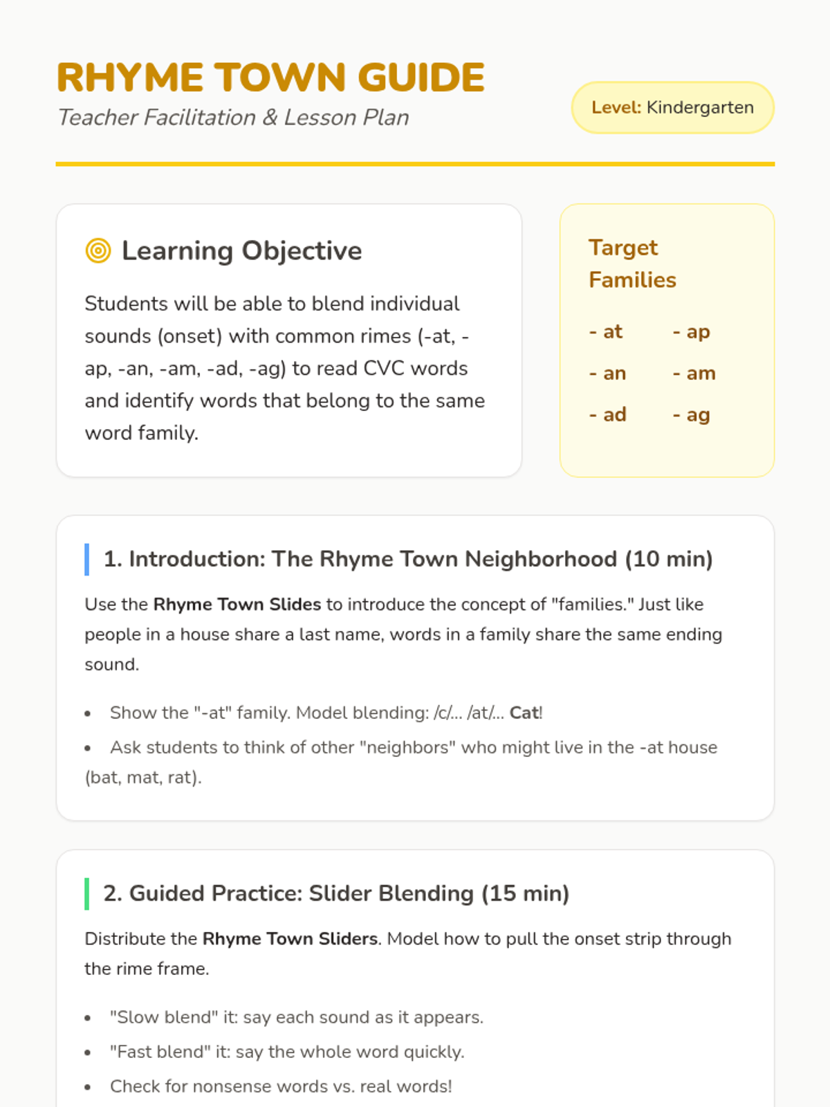 A comprehensive teacher facilitation guide with pacing, learning objectives, discussion prompts, and differentiation strategies for the short vowel lesson.