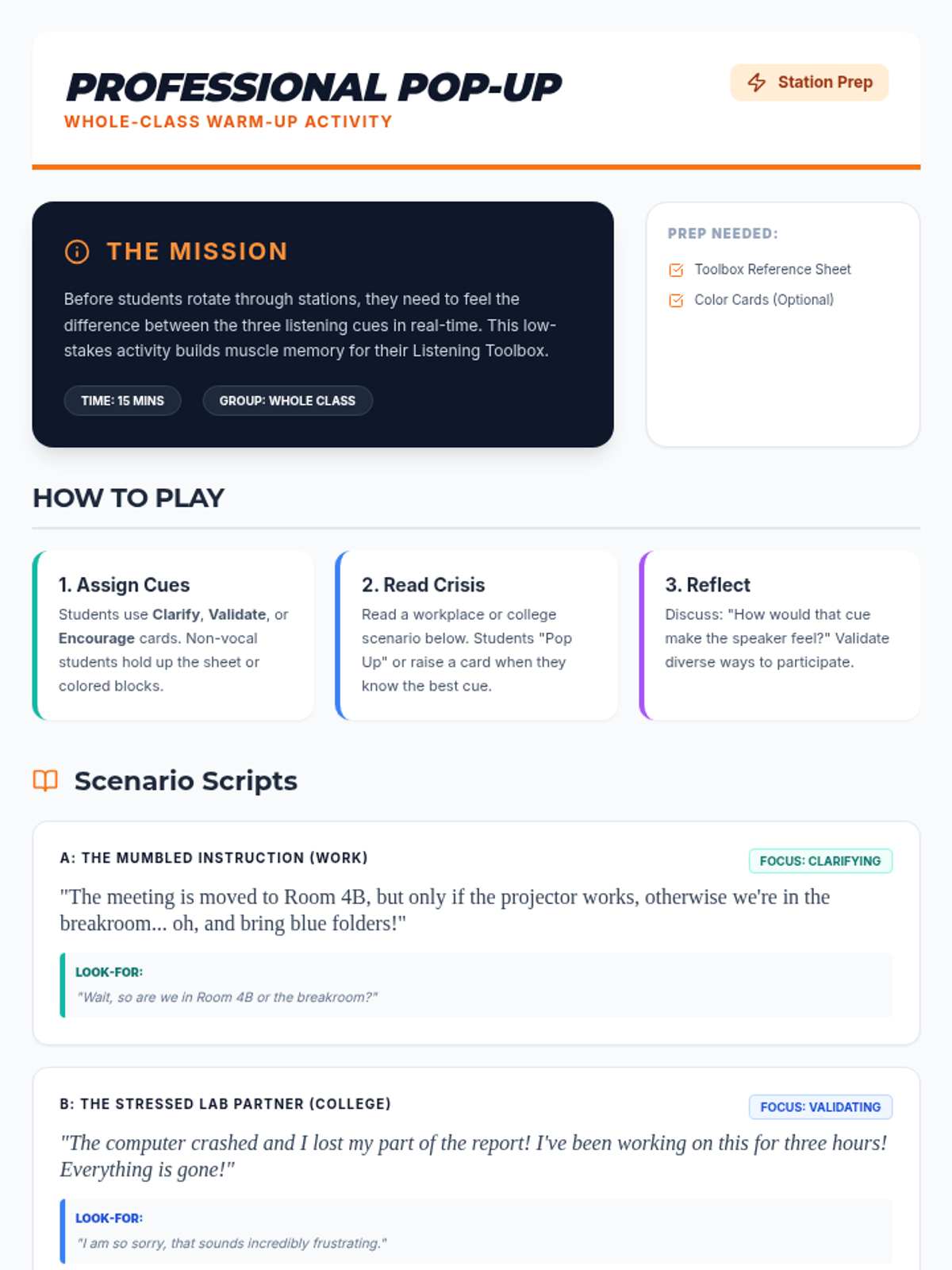 A whole-class preparatory activity called 'Professional Pop-Up' where students practice identifying and using active listening cues in real-time workplace and college scenarios.
