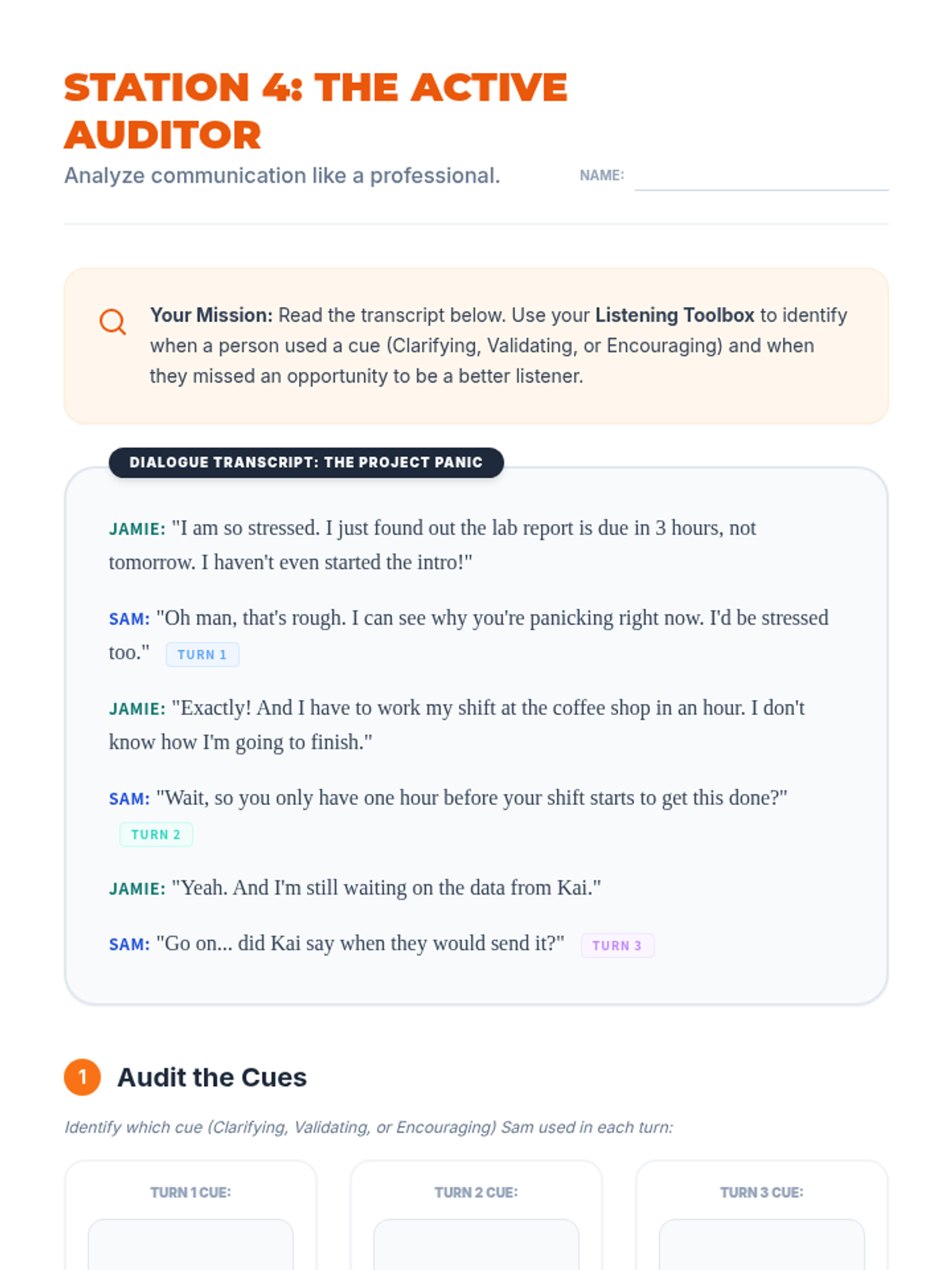 A worksheet for Station 4: The Active Auditor, where students analyze a dialogue script to identify and evaluate the use of active listening cues. Flow and spacing optimized for accessibility.
