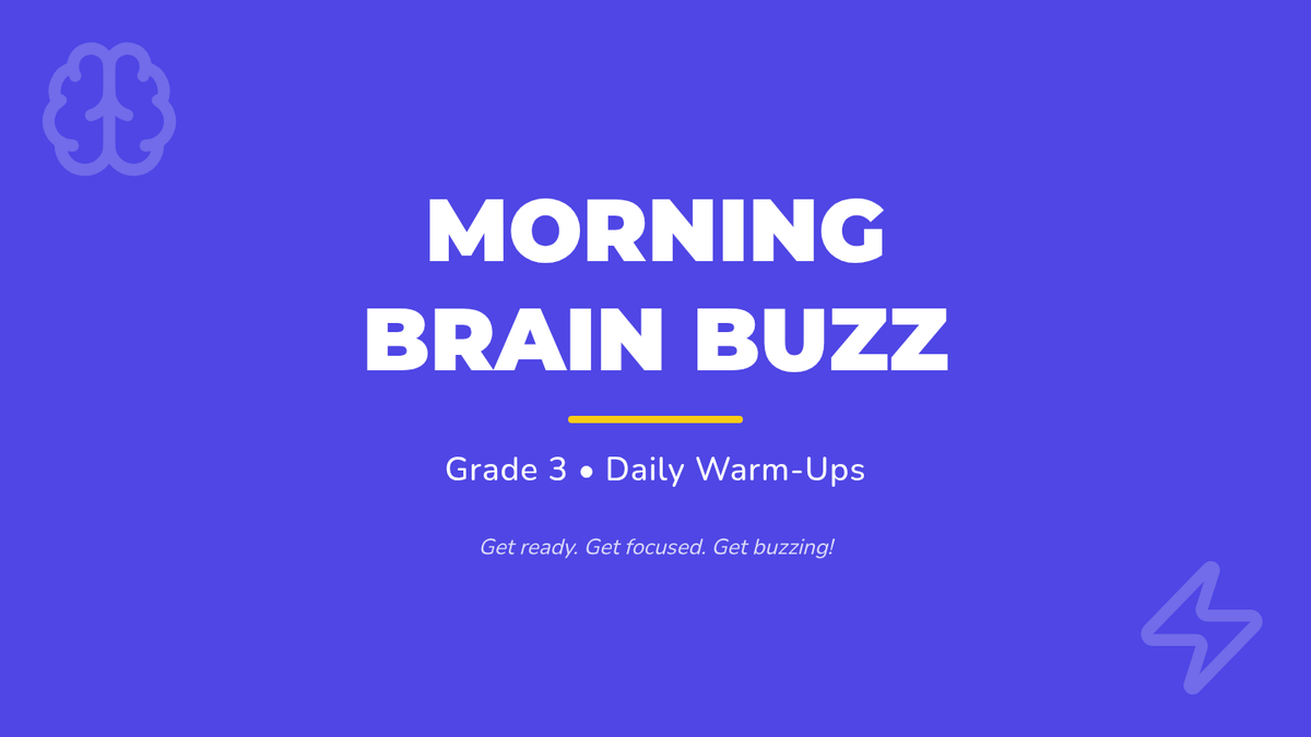 A 21-slide presentation featuring daily 5-minute morning warm-up activities for grade 3 students. Includes math problems, literacy tasks, IB learner profile reflections, growth mindset exercises, and mindfulness prompts.