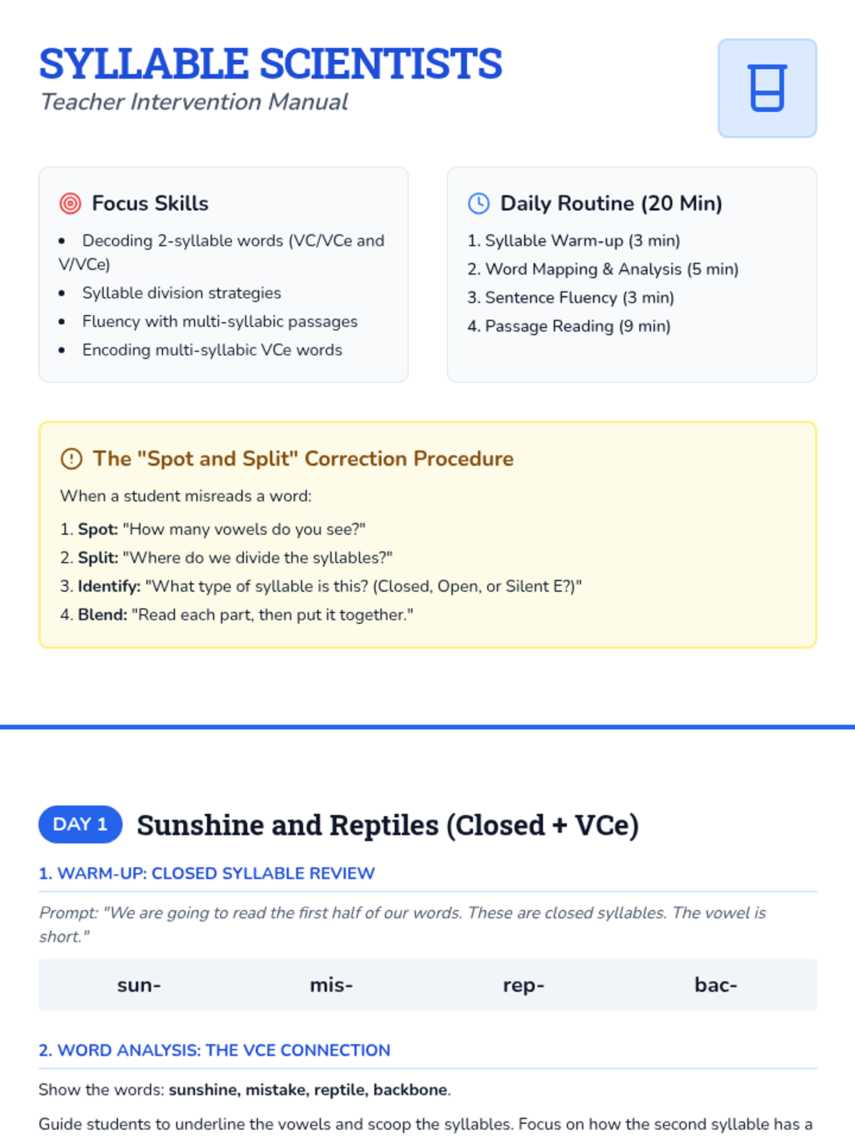 A comprehensive teacher manual for a 4-day silent-e intervention, featuring daily lesson plans, scripted prompts, syllable division strategies, and word lists for closed, open, and VCe syllable combinations.