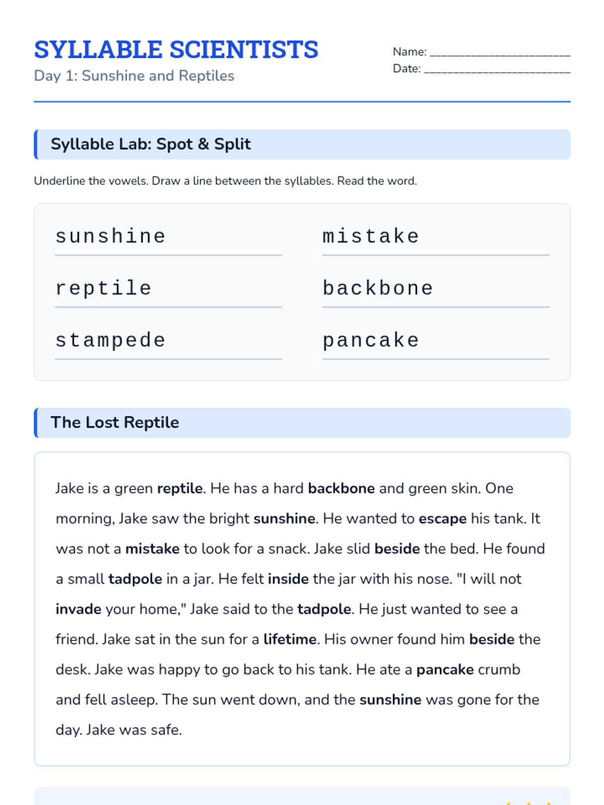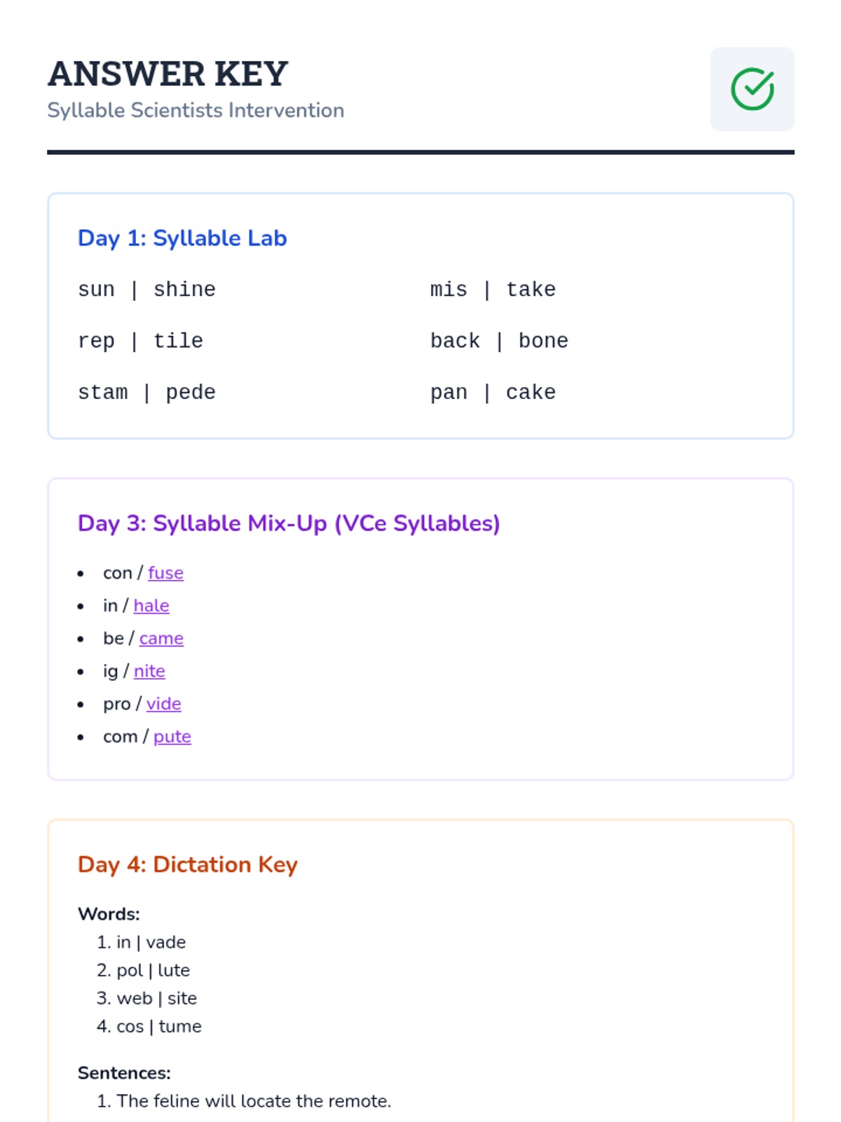 An answer key for the Syllable Scientists student workbook, including syllable division, VCe identification, and dictation words/sentences for all 4 days.