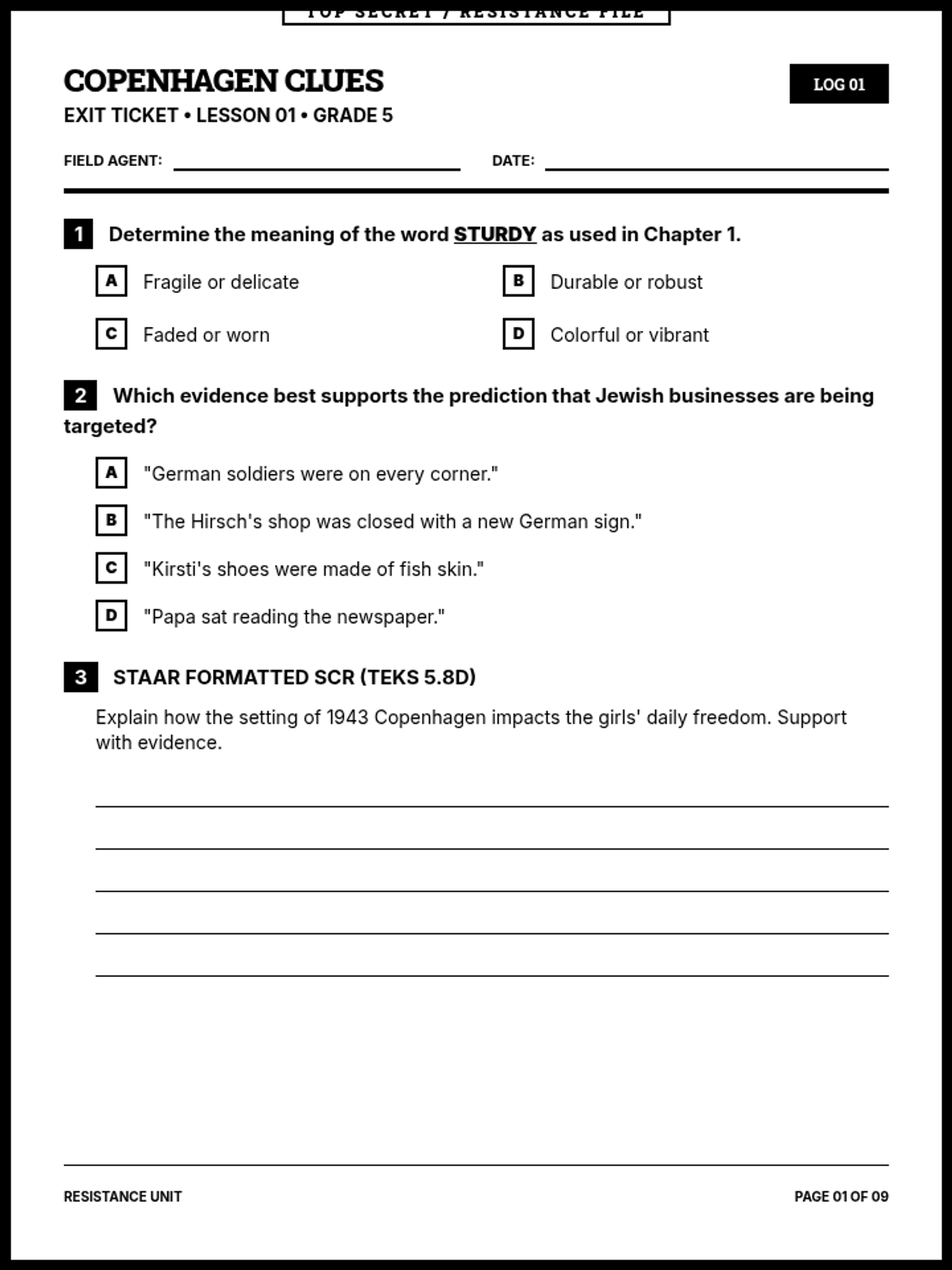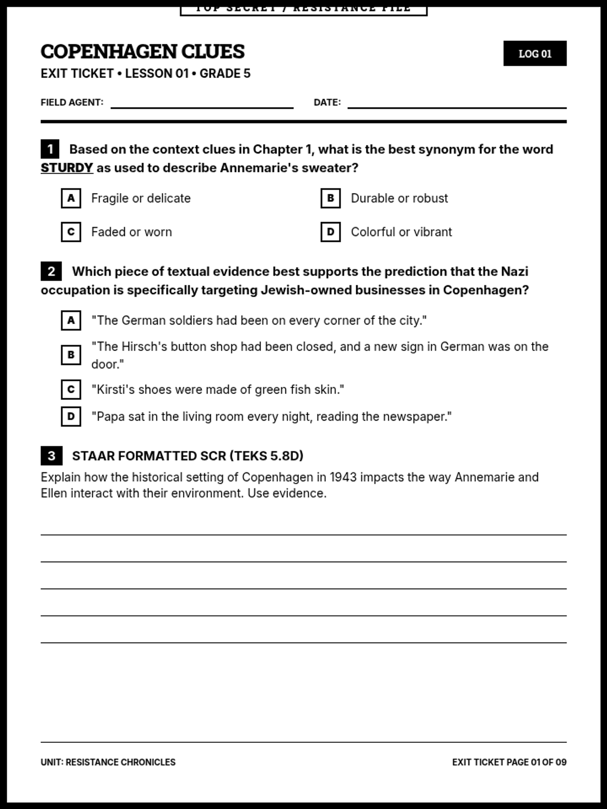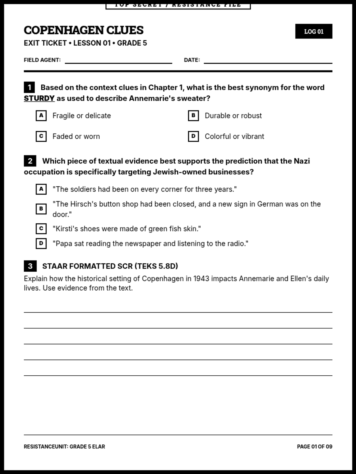 A comprehensive 9-page printable document containing all sequence exit tickets in a cohesive black-and-white 'Resistance File' aesthetic. Each ticket includes two MCQs and one 5-line SCR, aligned to 5th-grade ELAR TEKS.