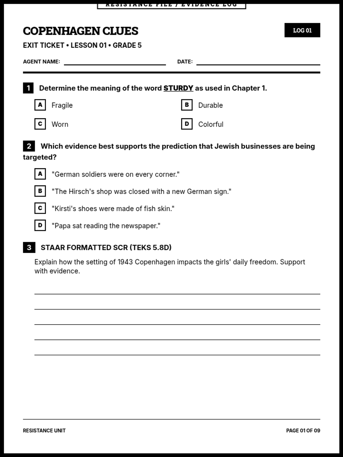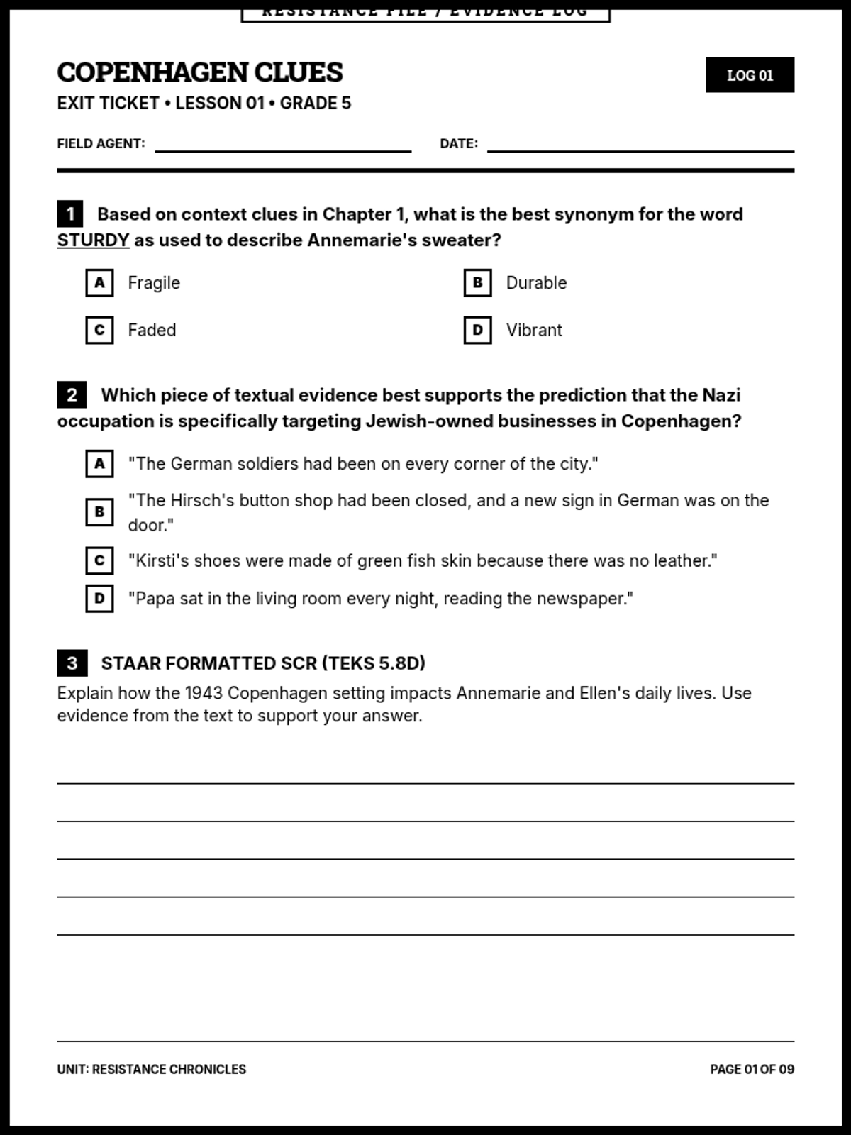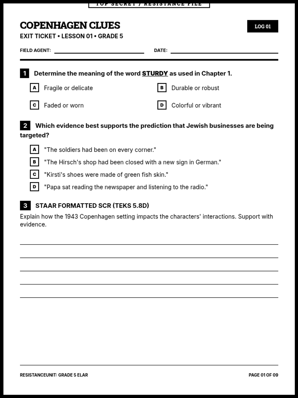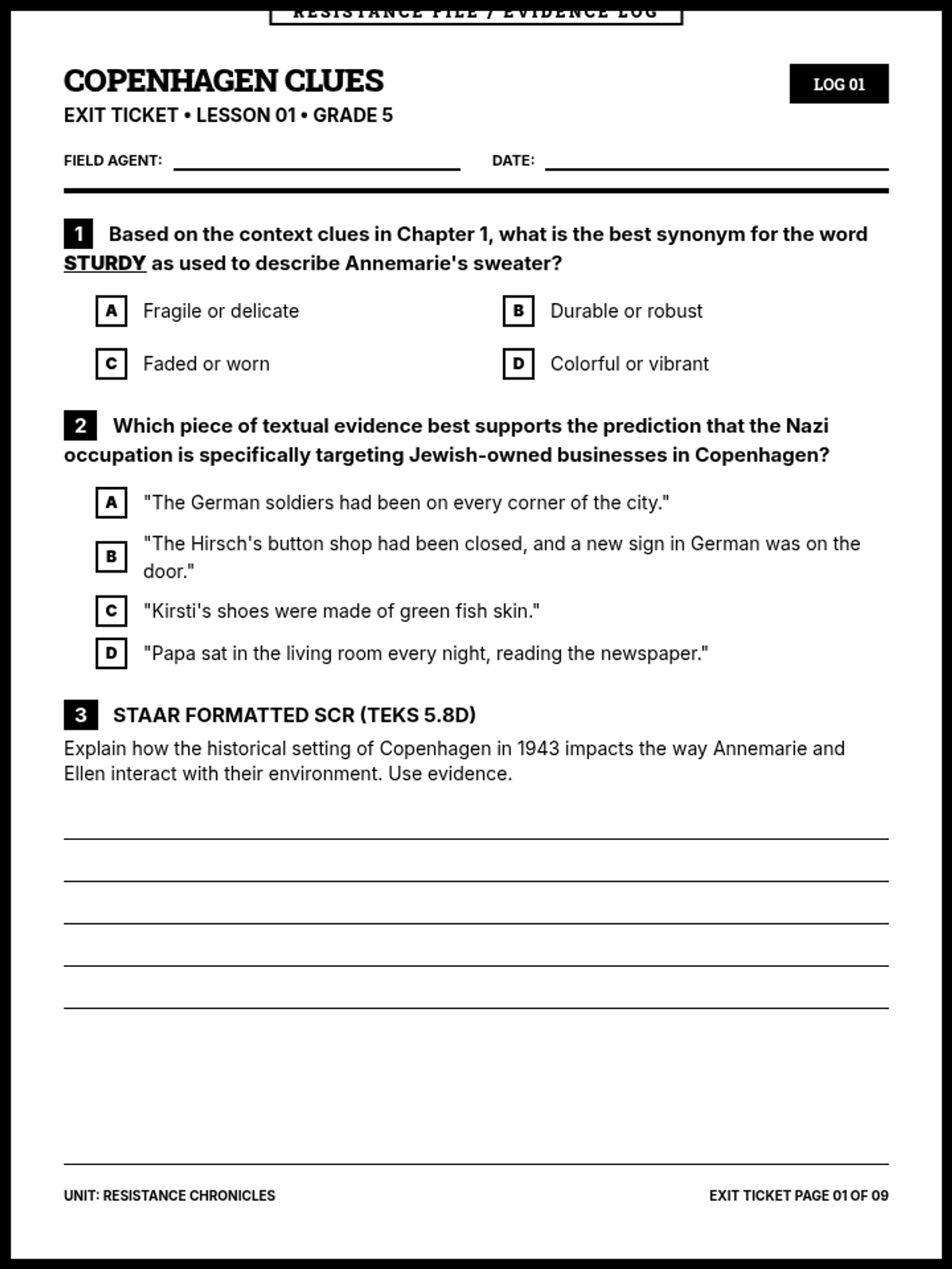 A comprehensive 9-page printable document containing all sequence exit tickets in a cohesive black-and-white 'Resistance File' aesthetic. Each ticket is strictly one page and includes two MCQs with 4 options and one 5-line SCR, aligned to 5th-grade ELAR TEKS.