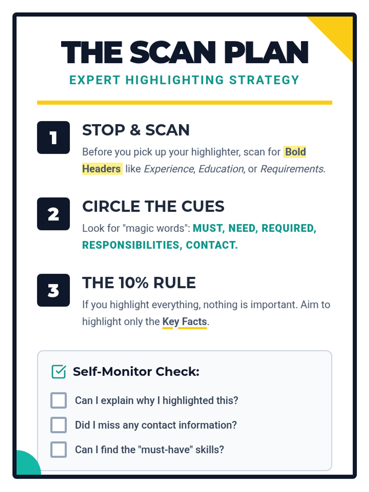 An anchor chart for self-monitoring highlighting strategies, providing students with a step-by-step "Scan Plan" for functional texts. Optimized for single-page printing.