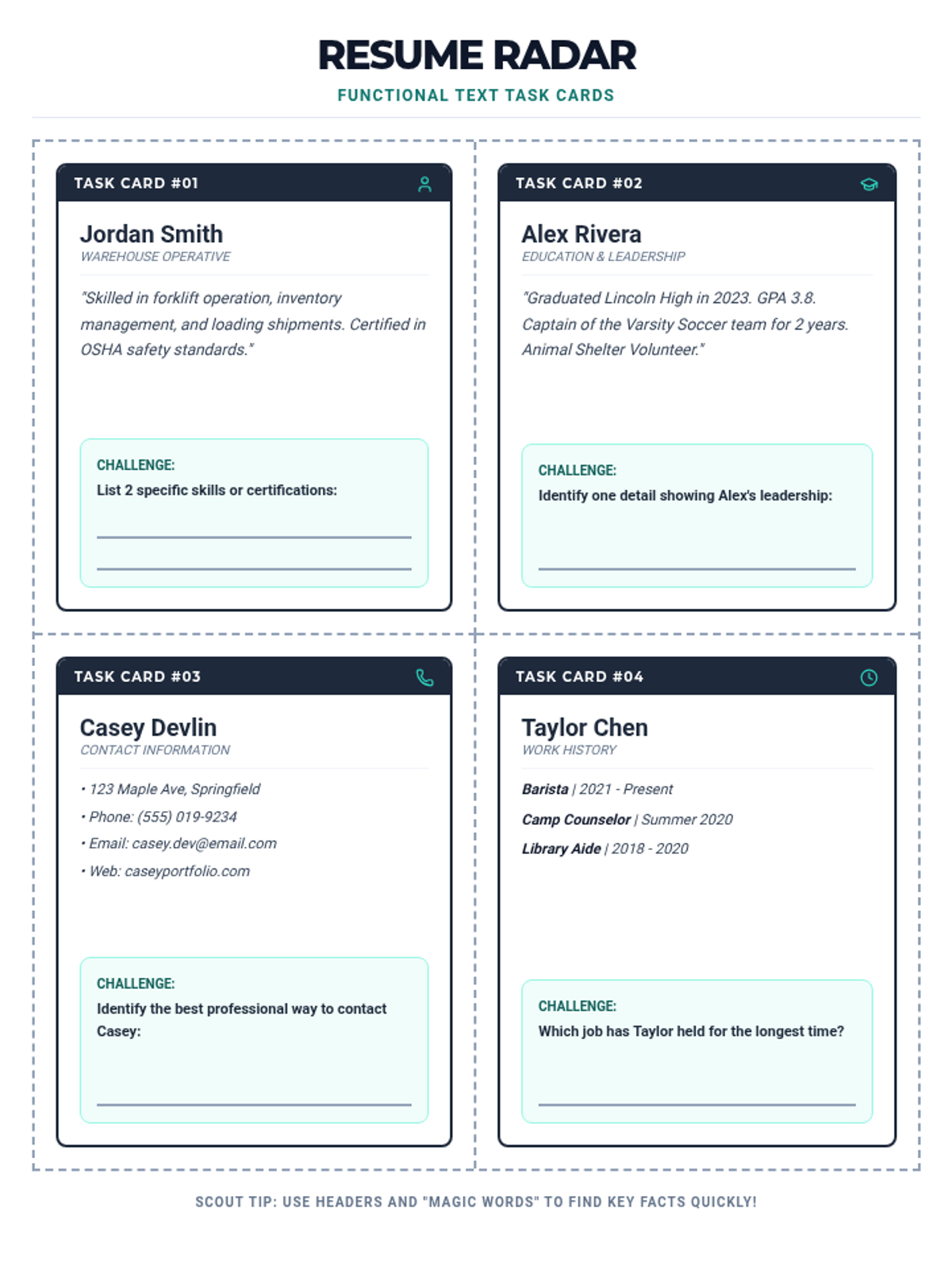 A set of 4 functional text task cards focusing on scanning resumes for specific details like experience, contact info, and work history. Includes cutting guides and student response areas.