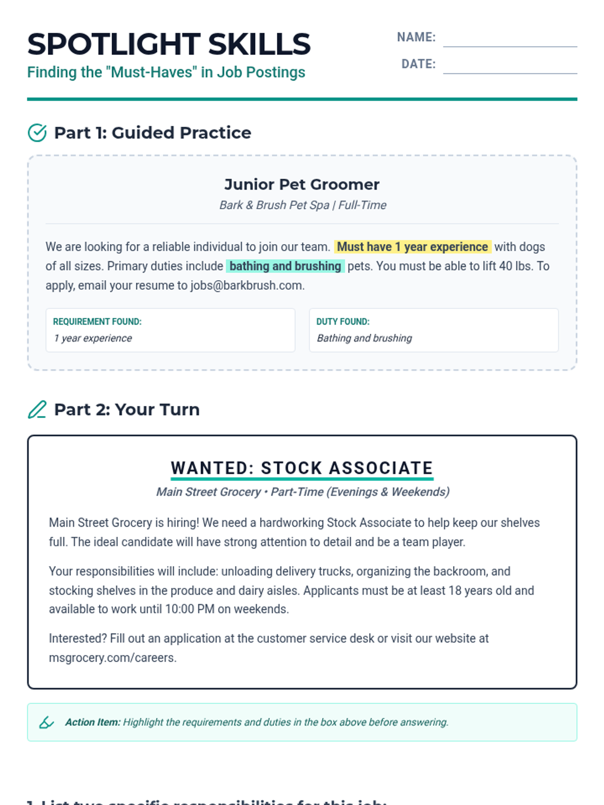 A two-page worksheet designed to help students identify and highlight key information in job postings using guided examples and independent practice. Revised for better page flow and work space.