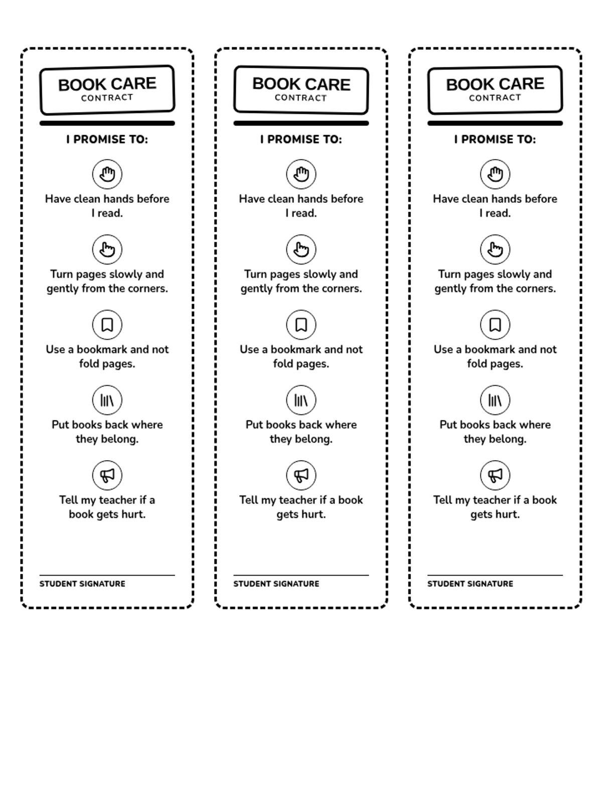 A high-contrast black and white printable sheet featuring four vertical bookmarks in a landscape layout. Each bookmark serves as a book care contract with five specific promises and a signature line.