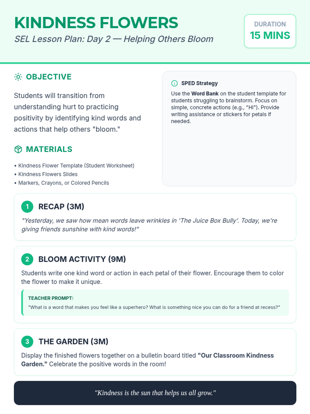 A 15-minute follow-up SEL lesson plan for teachers where students create "Kindness Flowers" to transition from understanding hurt to practicing positivity.