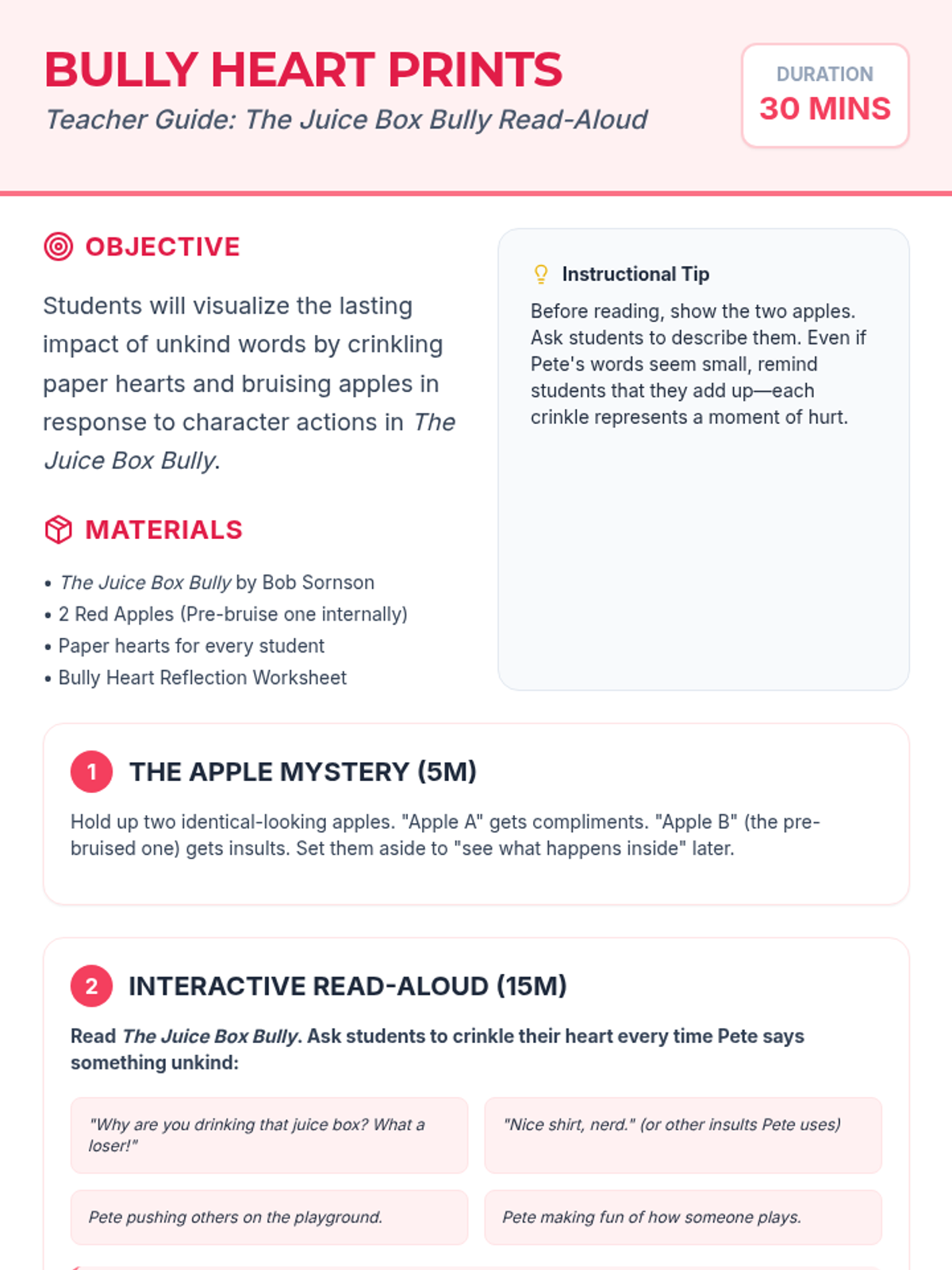 A teacher guide for an SEL lesson using 'The Juice Box Bully'. It includes specific pauses for crinkling paper hearts and bruising apples to visualize the internal impact of unkind words.