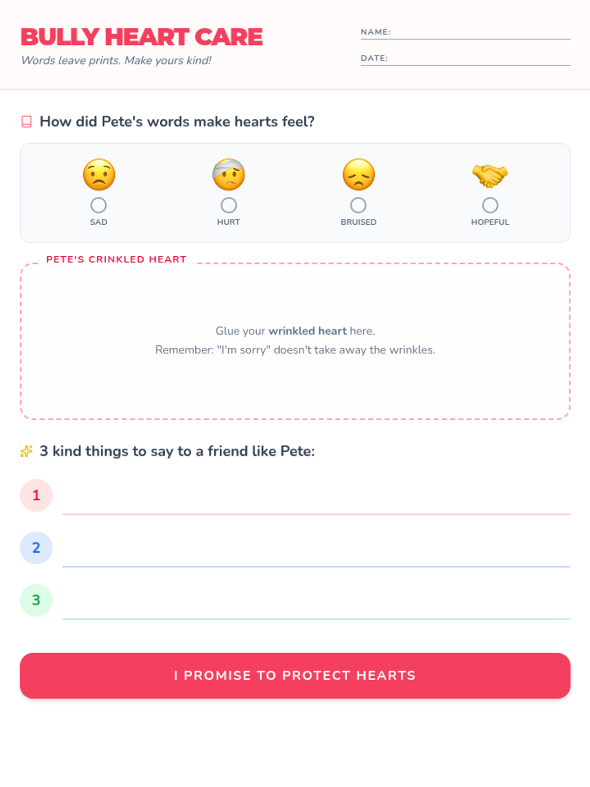A reflection worksheet for 'The Juice Box Bully' lesson where students glue their wrinkled hearts and brainstorm kind words to use in the classroom.