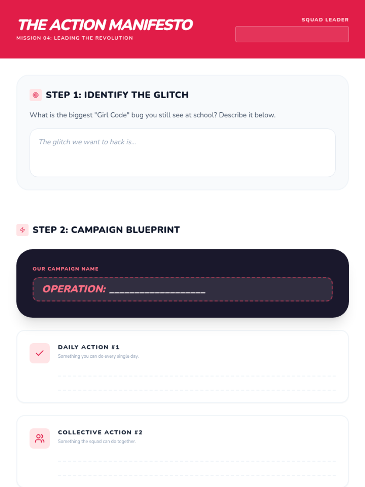 A student activity worksheet for the final week, where students design a campaign to improve school culture and take a collective pledge of empowerment.
