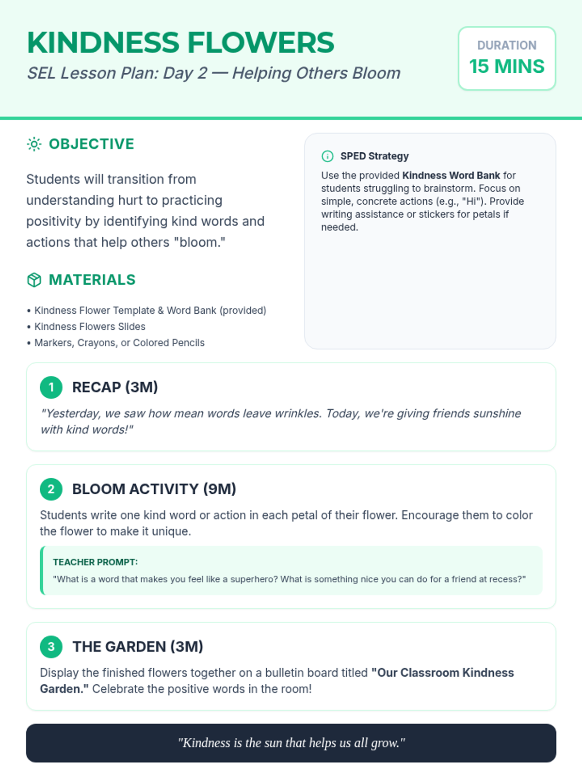 A 15-minute follow-up SEL lesson plan for teachers where students create "Kindness Flowers" to transition from understanding hurt to practicing positivity.