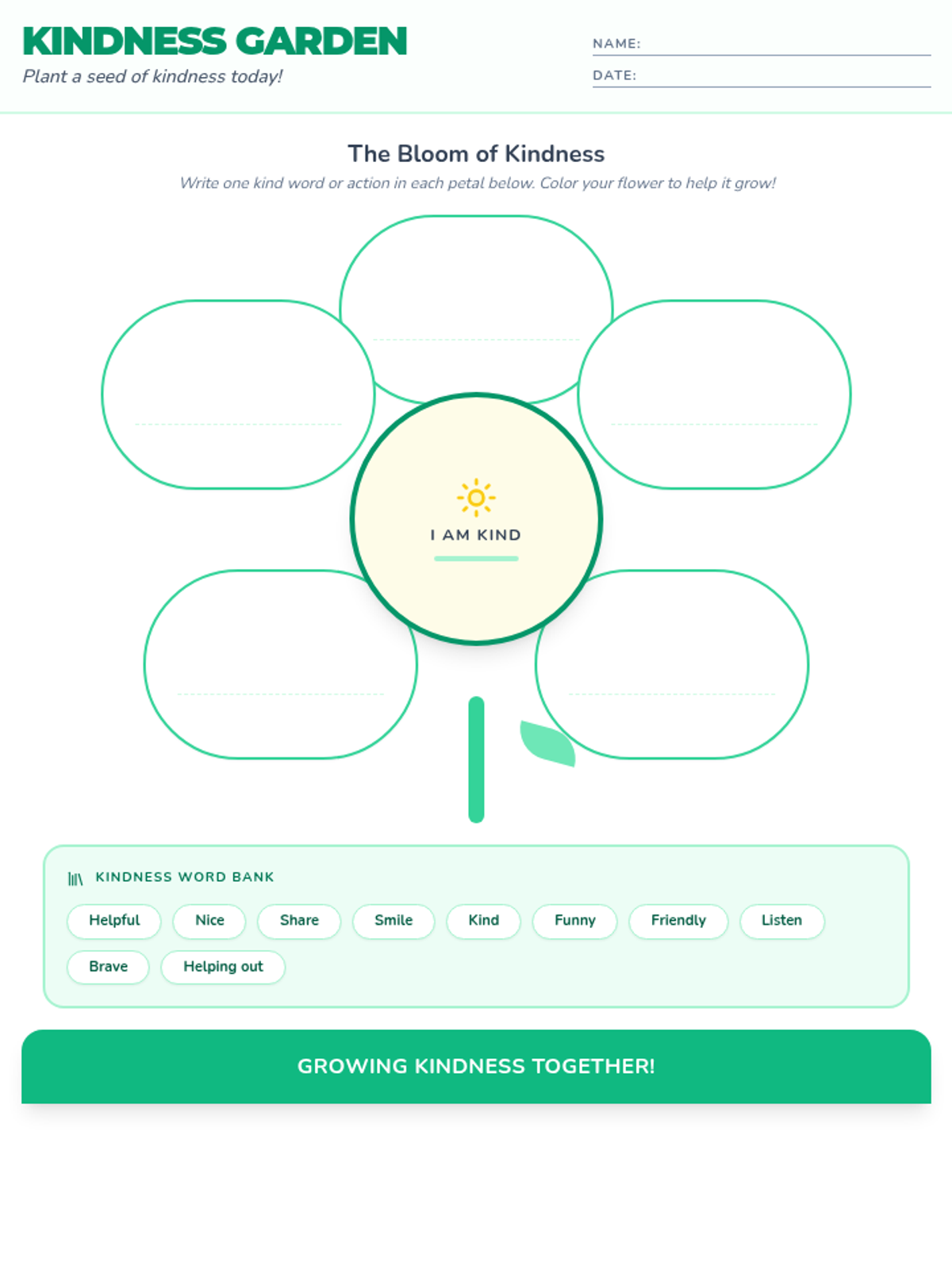 A worksheet for students to create their "Kindness Flower" with petals featuring kind words or actions. The flower is pre-assembled for easier completion, including a word bank for accessibility.