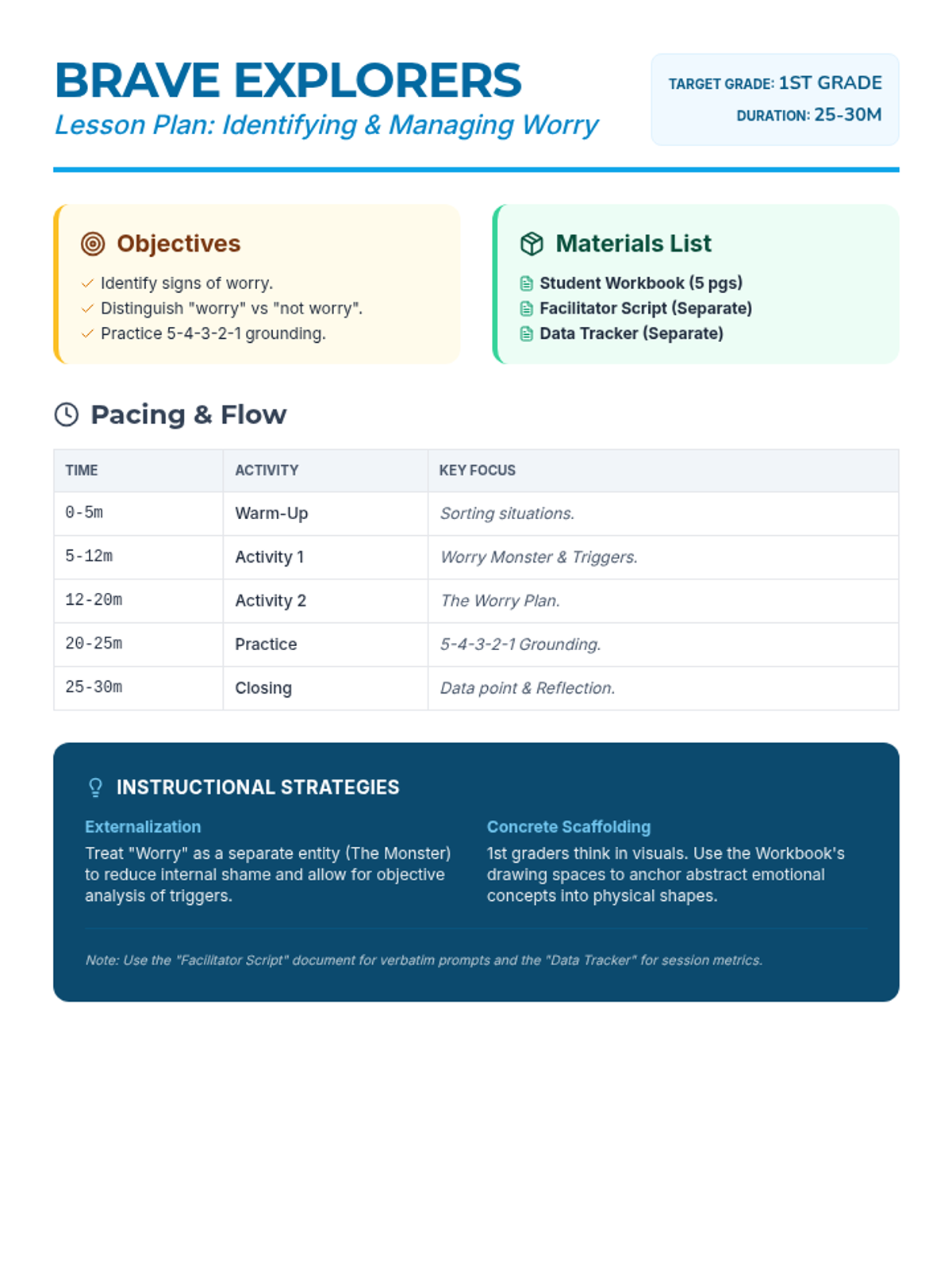 A comprehensive lesson plan for a 1st-grade individual session on identifying and managing worry, featuring a 25-30 minute pacing guide, objectives, and teaching strategies.