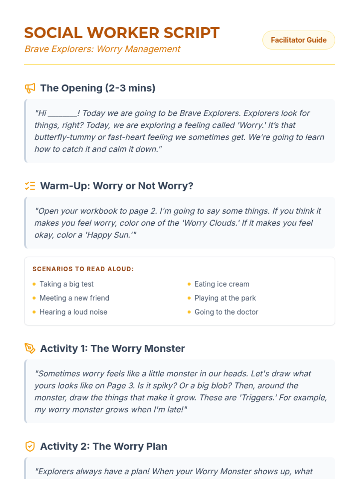 A detailed script and facilitator guide for a social worker to lead a 1st-grade individual session on worry, including verbatim prompts and transition statements for each activity.