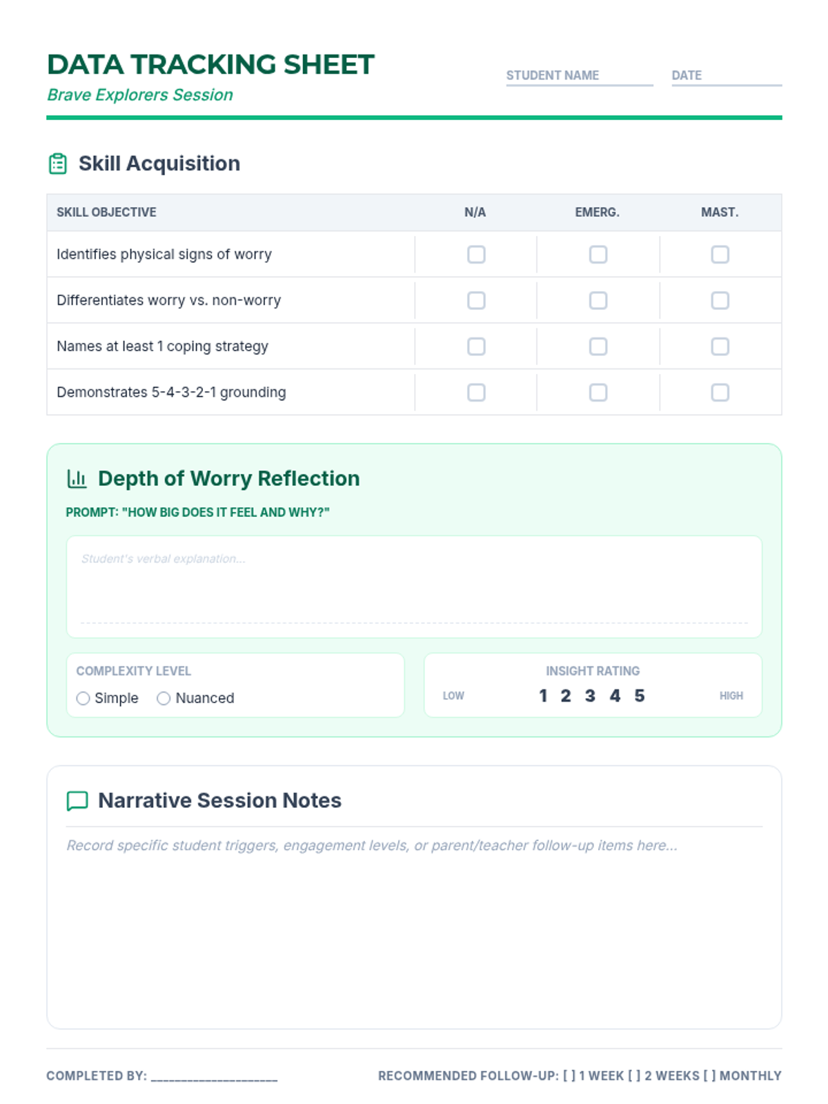 A data tracking sheet for social workers to monitor a student's progress in worry identification, coping skill mastery, and qualitative depth of emotional understanding.